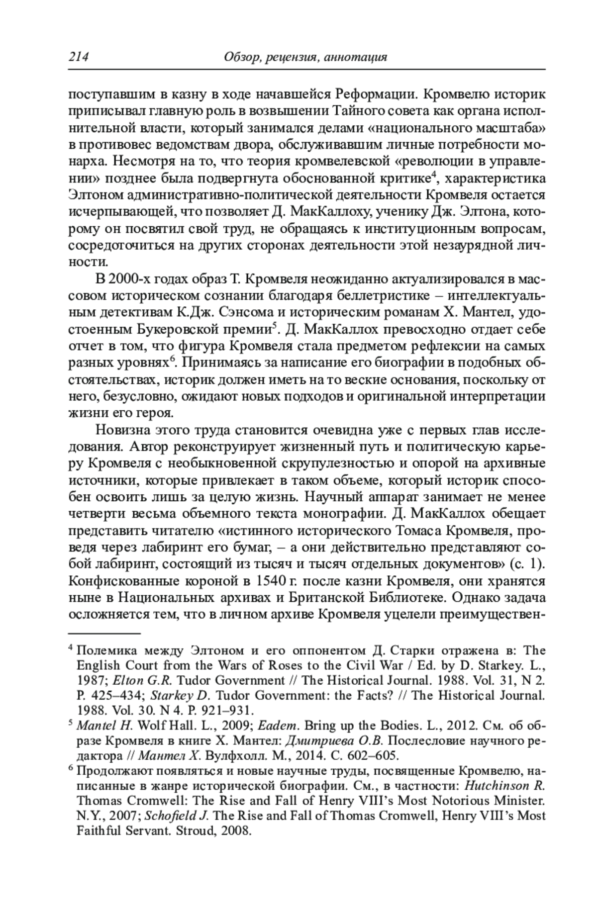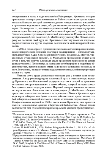 В 2000-х годах образ Т. Кромвеля неожиданно актуализировался в массовом историческом сознании благодаря беллетристике – интеллектуальным детективам К. Дж. Сэнсома и историческим романам Х. Мантел, удостоенным Букеровской премии 5. Д. МакКаллох превосходно отдает себе отчет в том, что фигура Кромвеля стала предметом рефлексии на самых разных уровнях 6. Принимаясь за написание его биографии в подобных обстоятельствах, историк должен иметь на то веские основания, поскольку от него, безусловно, ожидают новых подходов и оригинальной интерпретации жизни его героя