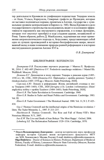1. Дмитриева О.В. Послесловие научного редактора // Мантел Х. Вулфхолл. М., 2014. С. 602-605.