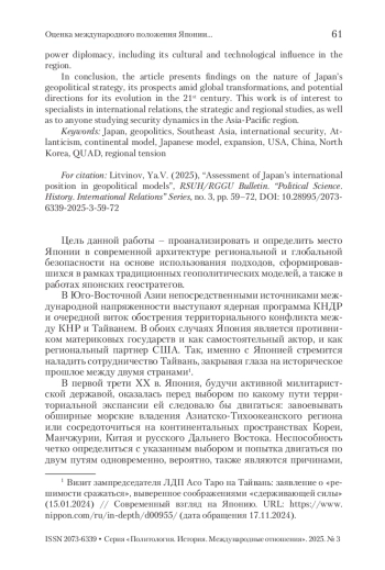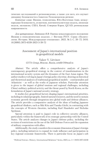 В статье проводится комплексный анализ современной геополитической стратегии Японии в контексте трансформации международной системы безопасности и динамики Восточно-азиатского региона. Автор исследует эволюцию японской внешнеполитической доктрины, опираясь на исторический и теоретический анализ традиционных геополитических моделей – континенталистской и атлантической, а также на разработки японских авторов. Особое внимание уделяется влиянию глобальной напряженности и региональных вызовов, включая военно-политическую активность Китая и угрозу со стороны Северной Кореи, на формирование японской стратегии национальной безопасности. Исследуются ключевые геополитические предпосылки, предопределяющие международные приоритеты Японии, в том числе фактор ее островного положения, ограниченность природных ресурсов и необходимость поддержания стабильного экономического роста через интеграцию в глобальные торговые и оборонные союзы. В статье проводится сравнительный анализ идей ведущих японских геополитиков, таких как Икки Кита и Танака Гиити, и их сопоставление с концепциями западных мыслителей, включая К. Хаусхофера и Н. Спикмена. Отдельное внимание уделяется роли Японии в альянсах коллективной безопасности, прежде всего в рамках стратегического партнерства с США. Анализируются изменения в оборонной политике Японии, включая пересмотр ограничений на применение Сил самообороны и рост военного сотрудничества с союзниками. В статье также рассматривается экономический аспект японской внешней политики, включая инициативы по расширению торгового влияния и участие в ключевых региональных экономических объединениях. Особое внимание уделено японской дипломатии в области «мягкой силы», включая культурное и технологическое влияние в регионе. В заключении формулируются выводы о характере японской геополитической стратегии, ее перспективах в условиях глобальных изменений и возможных направлениях эволюции в XXI веке. Работа представляет интерес для специалистов в области международных отношений, стратегических исследований и регионоведения, а также для всех, кто изучает динамику безопасности в Азиатско-Тихоокеанском регионе.