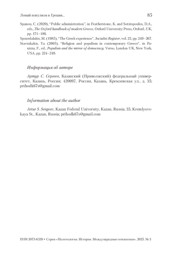 2. Сергеев, Дубровин 2020 - Сергеев А.С., Дубровин В.Ю. Пасокификация и подъем популизма в современном мире // «Дни науки» факультета социотехнических систем КНИТУ : сб. статей и сообщений Всероссийской научно-практической конференции молодых ученых, аспирантов и студентов (26 апреля - 8 мая 2019 г.). Казань: КНИТУ, 2020. С. 177-181.