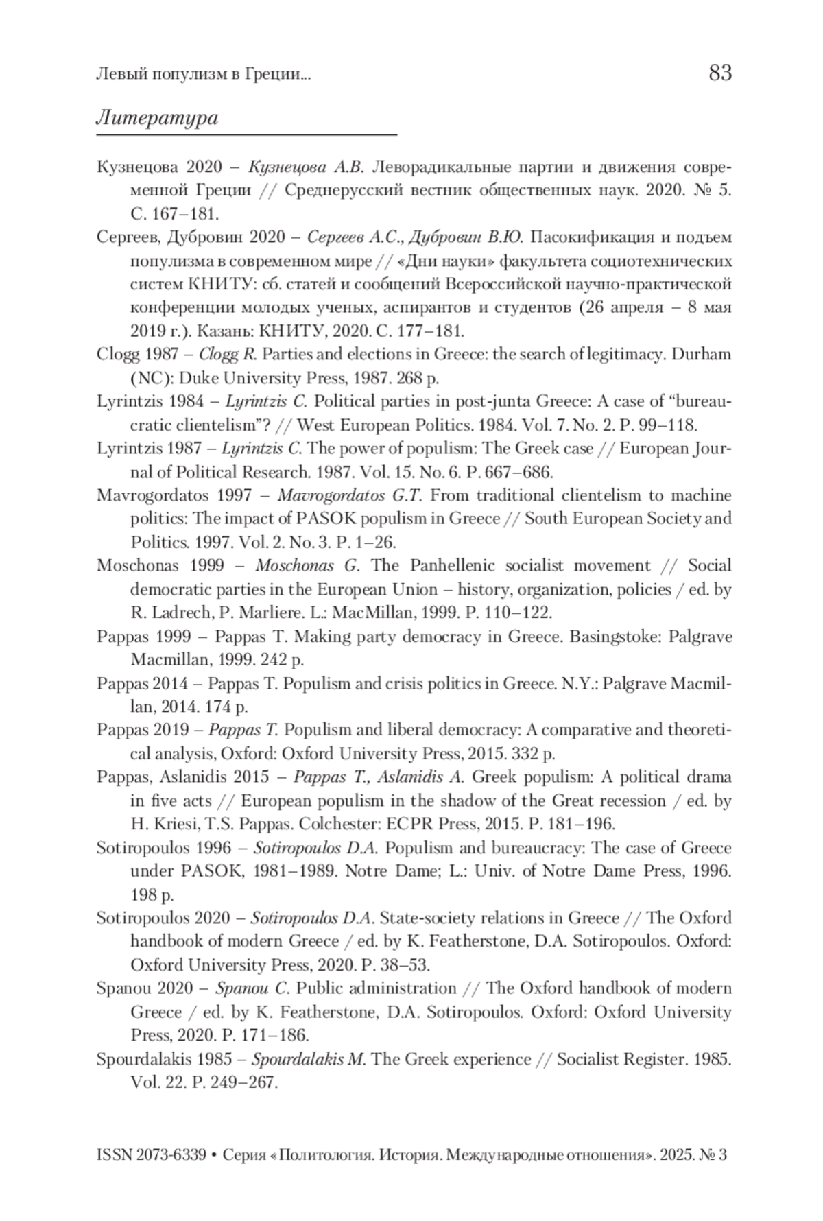 5. Lyrintzis 1987 - Lyrintzis C. The power of populism: The Greek case // European Journal of Political Research. 1987. Vol. 15. No. 6. P. 667-686.
