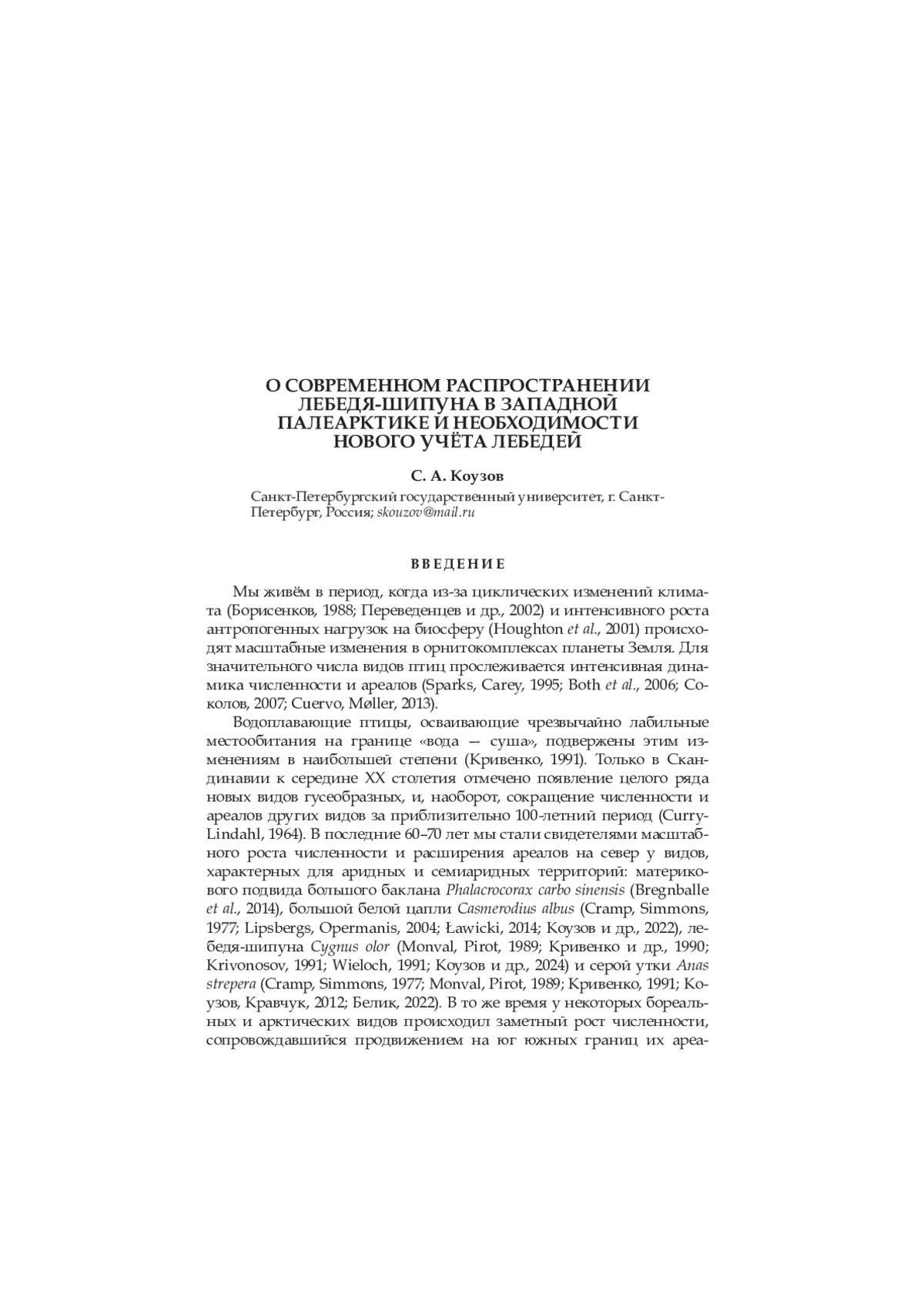 72. Kouzov S. A., Kravchuk A. V., Abakumov E. V., Afanaseva D. M. 2024a. Whooper Swans Cygnus cygnus nesting on offshore islands - a new occurrence or a well-forgotten old phenomenon? - Wildfowl, 74: 3-22.