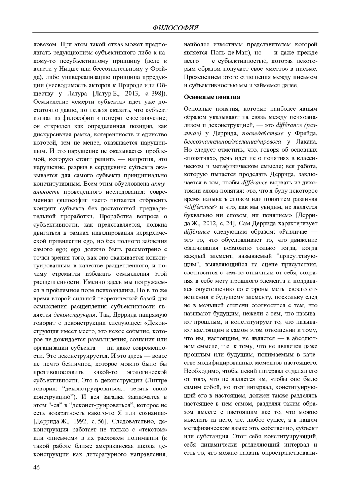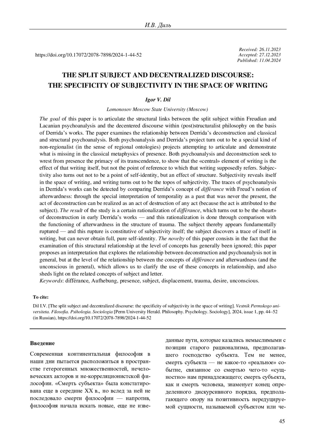 Целью данной работы является артикуляция структурных связей между расщепленным субъектом в рамках фрейдовского и лакановского психоанализа и децентрированным дискурсом в рамках (пост)структуралистского философствования на материале работ Деррида. Как психоанализ, так и проект Деррида оказываются особого рода не-регионалистскими (в смысле региональных онтологий) проектами, пытающимися артикулировать и продемонстрировать то, что упускается в классической метафизике присутствия. Как психоанализ, так и деконструкция направлены на то, чтобы вырвать у присутствия примат его трансцендентности, показать, что «центральный» элемент письма является эффектом самого этого письма, но не точкой референции, к которой это письмо якобы отсылает. Субъективность также оказывается не точкой самоналичия и самотождественности, а эффектом структуры. Субъективность обнаруживает себя в пространстве письма, а само письмо оказывается топосом субъективности. Обнаружить следы психоанализа в работах Деррида можно посредством сопоставления концепта différance Деррида и понятия последействия Фрейда: именно через особую трактовку темпоральности как прошлого, которое никогда не было настоящим, можно осуществить акт деконструкции как акт разрушения всякого акта (поскольку акт оказывается отнесенным к субъекту). Результатом работы является определенная рационализация différance, которое оказывается «сердцем» деконструкции у раннего Деррида, и такая рационализация осуществляется через сопоставление с функционированием последействия в структуре травмы. Субъект тем самым оказывается принципиально разорванным, и этот разрыв является конститутивным для субъективности как таковой, субъект обнаруживает в письме след себя самого, но никогда не может обрести полного, чистого самоналичия. Новизна данной работы заключается в том, что проработке этой структурной взаимосвязи на уровне понятий, как правило, не уделяют должного внимания; в данной работе предлагается такая интерпретация, которая прослеживает взаимосвязь между деконструкцией и психоанализом не в общем, а на уровне связи концептов différance и последействия (а также бессознательного вообще), что позволяет прояснить употребление этих понятий во взаимосвязи, а также проливает свет на смежные понятия субъекта и письма.