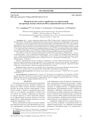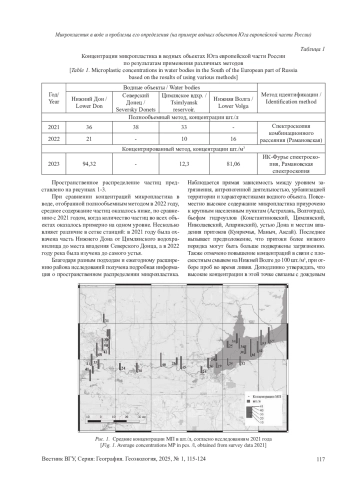Цель - оценка содержания микропластика (МП) в Нижнем Дону, Северском Донце, Цимлянском водохранилище, и Нижней Волге, апробирование различных методик отбора проб и идентификации состава частиц. Материалы и методы. Использовались два метода пробоотбора: полнообъемный в 2021 и 2022 годах и концентрированный в 2023 году. В первом случае отбор производился батометром, размерный диапазон составлял 0,1-5 мм; второй способ отбора заключался в тралении нейстонной сети, нижняя граница соответствовала номиналу ячейки 0,3 мм. Пробоподготовка проводилась по модифицированному методу NOAA, визуальный разбор частиц совершался с помощью микроскопа, состав определялся спектроскопией комбинационного рассеяния и ИК-Фурье спектроскопией, поверхность МП изучалась с помощью СЭМ, рассчитывался уровень опасности полимеров PHI. Результаты и обсуждение. Средние концентрации по данным 2021 года составили: в Нижнем Дону - 36 шт./л, в Северском Донце - 38 шт./л, Цимлянском водохранилище - 33 шт./л. В 2022 году в Нижнем Дону обнаружены 21 шт./л, Цимлянском водохранилище 10 шт./л, Нижней Волге 16 шт./л. В 2023 года, при отборе тралением, в водах Нижнего Дона концентрации микропластика составили 94,32 шт./м3, Цимлянского водохранилища - 12,3 шт./м3, в Нижней Волге - 81,06 шт./м3. Выводы. Характеристики частиц отличаются в зависимости от метода отбора: батометром были охвачены преимущественно прозрачные волокна, размером 0,3 мм, применения сетей дало более высокое разнообразие и крупность. Максимумы концентраций МП в воде зафиксированы около урбанизированных территорий, бьефов гидроузлов, устьев притоков, а также при воздействии плоскостного смыва.