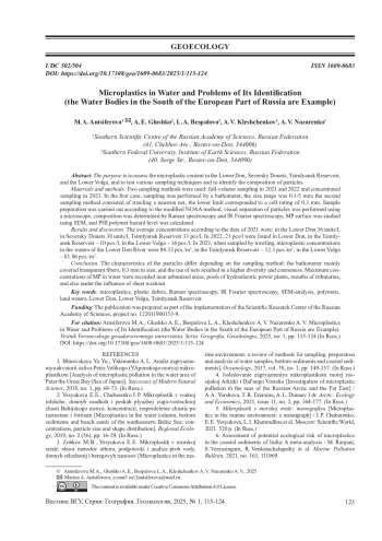 2. Есюкова Е. Е., Чубаренко И. П. Микропластик в водной толще, донных осадках и песках пляжей юго-восточной части Балтийского моря: концентрации, распределение частиц по размерам и формам // Региональная экология, 2019, № 2 (56), с. 16-29. EDN: IGHCPK