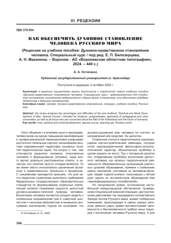 Статья: КАК ОБЕСПЕЧИТЬ ДУХОВНОЕ СТАНОВЛЕНИЕ ЧЕЛОВЕКА РУССКОГО МИРА (РЕЦЕНЗИЯ НА УЧЕБНОЕ ПОСОБИЕ: ДУХОВНО-НРАВСТВЕННОЕ СТАНОВЛЕНИЕ ЧЕЛОВЕКА. СПЕЦИАЛЬНЫЙ КУРС / ПОД РЕД. Е. П. БЕЛОЗЕРЦЕВА, А. Н. МАХИНИНА. - ВОРОНЕЖ: АО «ВОРОНЕЖСКАЯ ОБЛАСТНАЯ ТИПОГРАФИЯ», 2024.-440 С.) (2024)