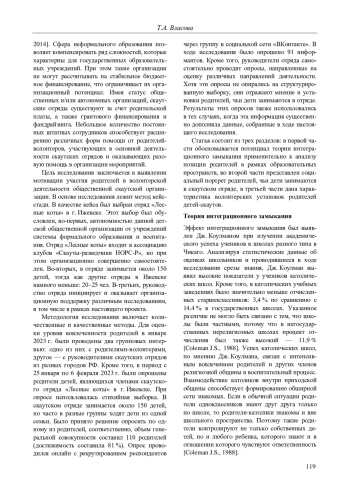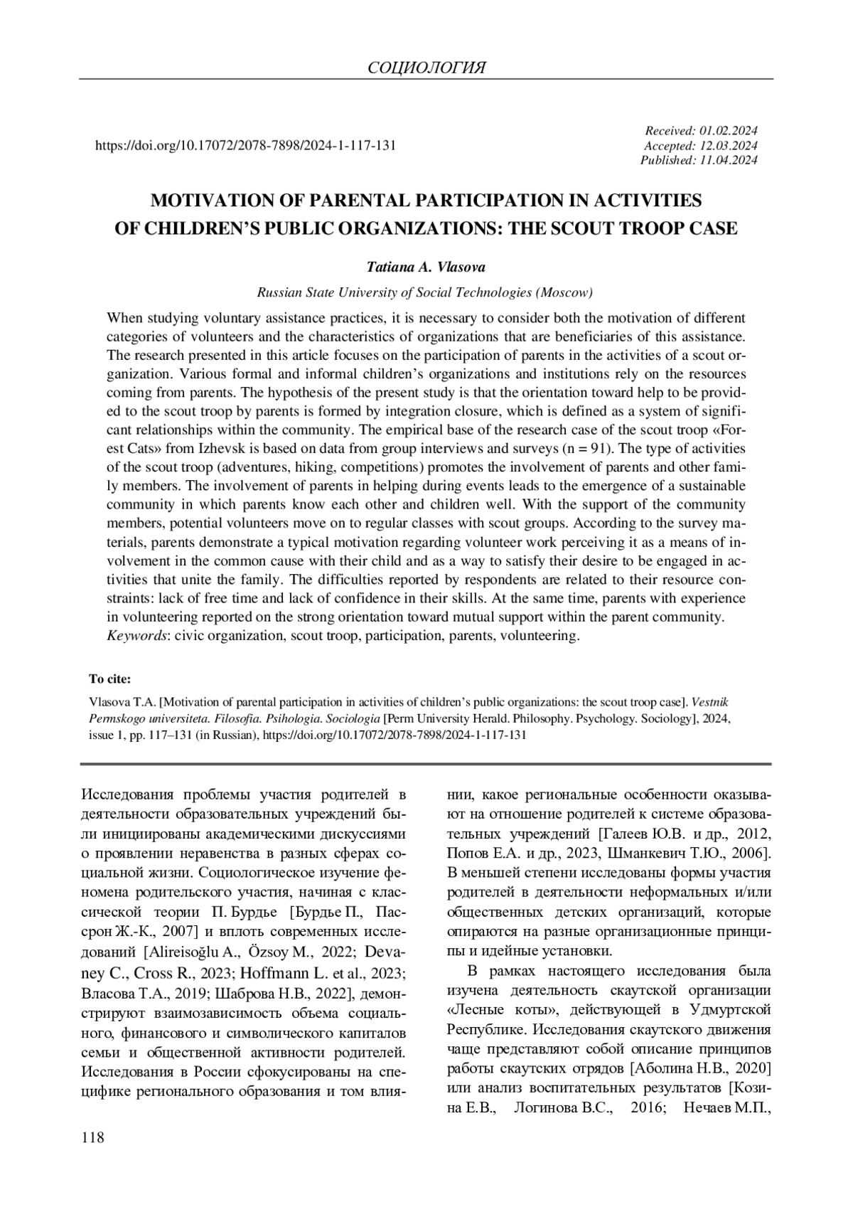При изучении практик добровольной помощи необходимо учитывать как мотивацию разных категорий волонтеров, так и особенности организаций, которые являются бенефициарами этой помощи. Исследование, представленное в настоящей статье, фокусируется на участии родителей в деятельности скаутской организации. На ресурсы, исходящие от родителей, рассчитывают разные формальные и неформальные детские организации и учреждения. Гипотеза настоящего исследования состояла в том, что установка на помощь со стороны родителей скаутскому отряду опирается на интеграционное замыкание, под которым понимается система значимых для них взаимоотношений внутри сообщества. Эмпирическая база исследовательского кейса скаутского отряда «Лесные коты» из Ижевска опирается на данные групповых интервью и опроса (n = 91). Тип мероприятий скаутского отряда (приключения, походы, соревнования) способствует вовлечению родителей и других членов семьи. Привлечение родителей к помощи во время мероприятий приводит к появлению устойчивого сообщества, в котором родители хорошо знают друг друга и детей. При поддержке членов сообщества потенциальные волонтеры переходят к проведению регулярных занятий с группами скаутов. По материалам опроса, родители демонстрируют типичную мотивацию относительно волонтерской работы с преобладанием ценностей причастности к общему делу и стремлением к деятельности, объединяющей семью. Трудности, о которых сообщают респонденты, связаны с ресурсными ограничениями: недостатком времени и неуверенностью в своих умениях и навыках. При этом родители, имеющие опыт добровольческой помощи, сообщили о сложившейся установке на взаимную поддержку внутри родительского сообщества.