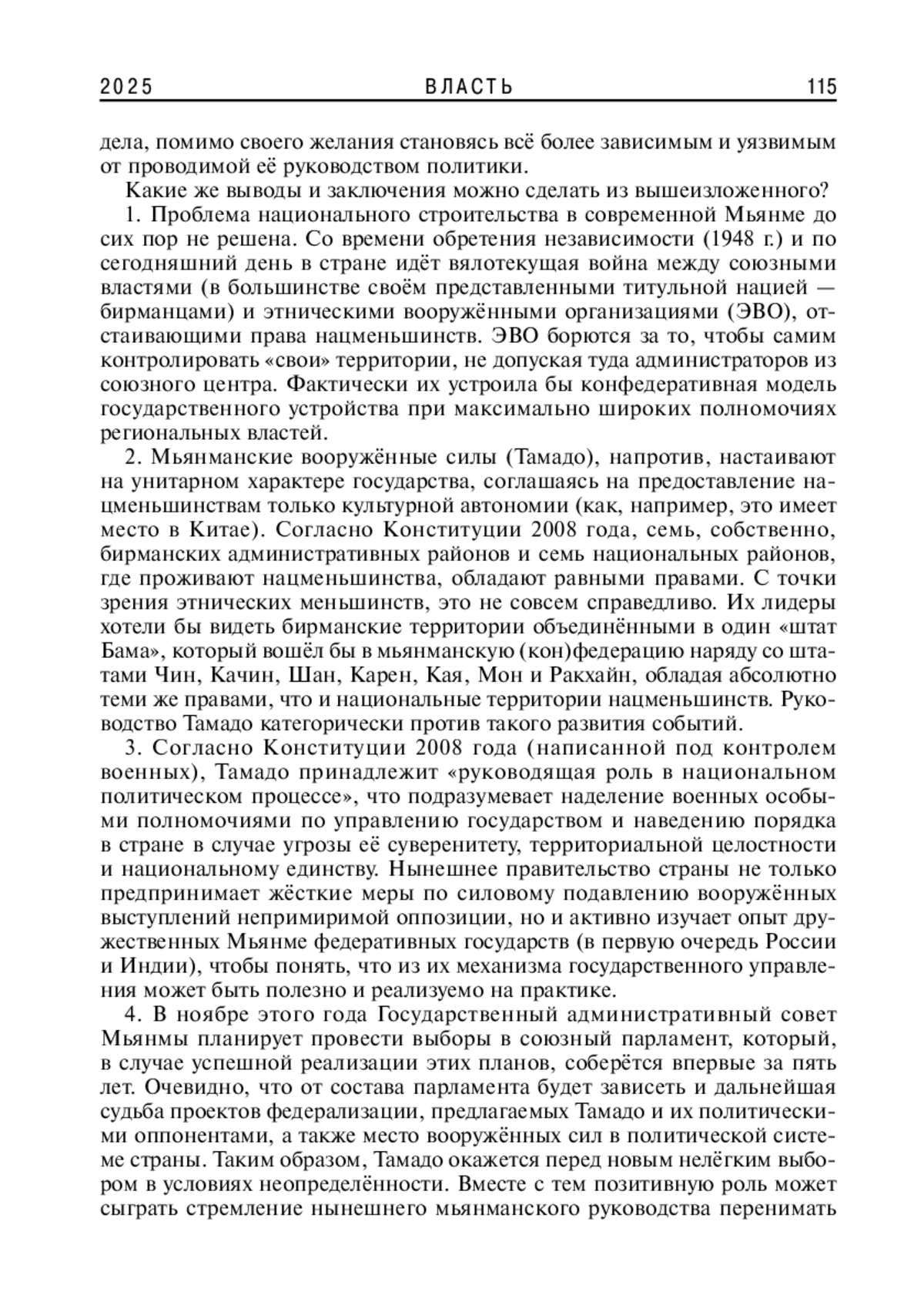 Статья раскрывает актуальную тему, связанную с перспективами установления мира и восстановления национального единства в Республике Союз Мьянма. В ней кратко освещаются истоки национальной политики Нейпьидо, обобщаются и систематизируются факторы, влияющие на процесс становления мьянманской государственности после обретения независимости, рассматриваются различия в подходах ведущих политических сил страны к проблеме федерализации и нациестроительства. Проводятся структурно- исторические параллели между российской и мьянманской политической традицией, подчёркивается важность российского опыта для постепенной трансформации политической системы Мьянмы в сторону её большей открытости и демократичности.