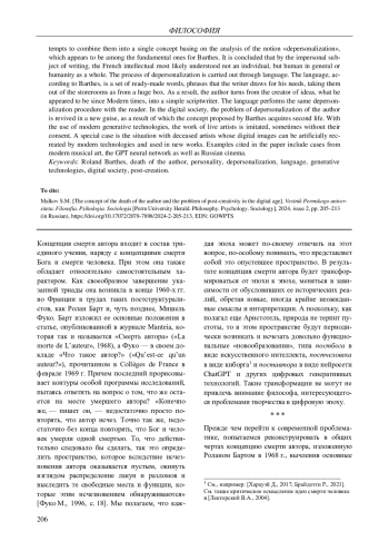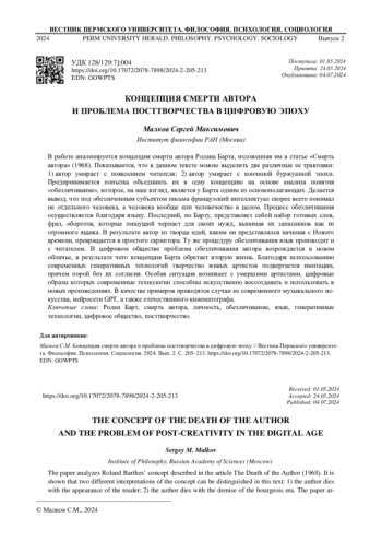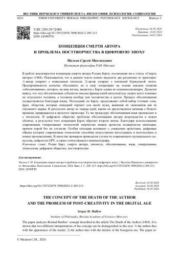 МАЛКОВ С. М. КОНЦЕПЦИЯ СМЕРТИ АВТОРА И ПРОБЛЕМА ПОСТТВОРЧЕСТВА В ЦИФРОВУЮ ЭПОХУ // ВЕСТНИК ПЕРМСКОГО УНИВЕРСИТЕТА. ФИЛОСОФИЯ. ПСИХОЛОГИЯ. СОЦИОЛОГИЯ. 2024. № 2