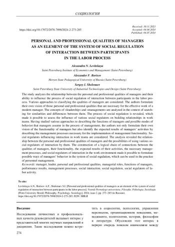 Проанализирована взаимосвязь личностных и профессиональных качеств руководителей с их возможностями влиять на процесс социального регулирования взаимодействия участников трудового процесса. Рассмотрены различные подходы к классификации качеств руководителей, на основании анализа сформулировано собственное видение авторов о тех личностных и профессиональных качествах, которые необходимы для эффективной работы современного руководителя. Проанализированы понятия «лидерство» и «руководство» в контексте поиска сходств и отличий между ними. Раскрыт процесс социального регулирования, что позволило оценить влияние различных социальных регуляторов на построение взаимоотношений в трудовых коллективах. Изучены различные подходы к описанию функций руководителей и возможных способов поведения, которые руководители принимают на себя в процессе управления. Сформулировано собственное видение функционала руководителей, обозначены ожидаемые результаты их деятельности посредством описания управленческих процессов, необходимых для реализации руководящего функционала. Рассмотрены социальные регуляторы, влияющие на взаимодействие в трудовых коллективах. По результатам анализа выявлена взаимосвязь личностных и профессиональных качеств руководителей и возможностей использования ими различных социальных регуляторов взаимодействия. Построение логической цепочки связи качеств руководителей, их функционала, ожидаемых результатов их деятельности, необходимых для этого управленческих процессов и социальных регуляторов взаимодействия в трудовой среде, позволило сформулировать возможные способы поведения руководителей в системе социального регулирования, которые могут применяться в практике управления персоналом.