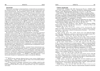 1. Асмолов К.В., Захарова Л.В. 2020. Отношения России с КНДР в XXI веке: итоги двадцатилетия // Вестник Российского университета дружбы народов. Серия: Международные отношения. Т. 20. № 3. С. 585-604. EDN: KWBJKW