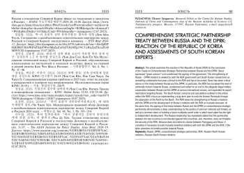 Статья посвящена реакции Республики Корея (РК) на заключение Договора о всеобъемлющем стратегическом партнерстве между Россией и КНДР. Рассматривается позиция правительства РК, а также анализируются взгляды южнокорейских исследователей на укрепление отношений между Москвой и Пхеньяном, в частности, их опасения в связи с подписанием договора, оценки перспектив российско-северокорейских отношений и рекомендации относительно действий РК в этой связи. Также представлена российская позиция относительно ситуации на Корейском полуострове и укрепления партнерства с КНДР.