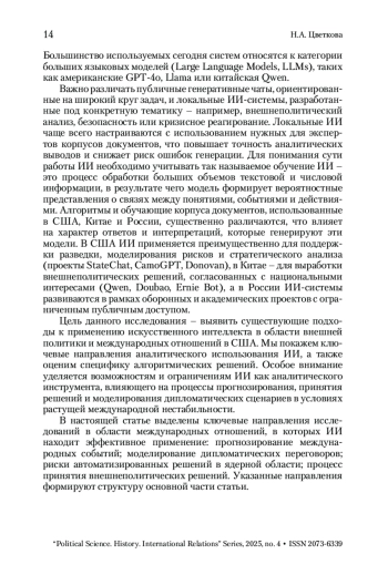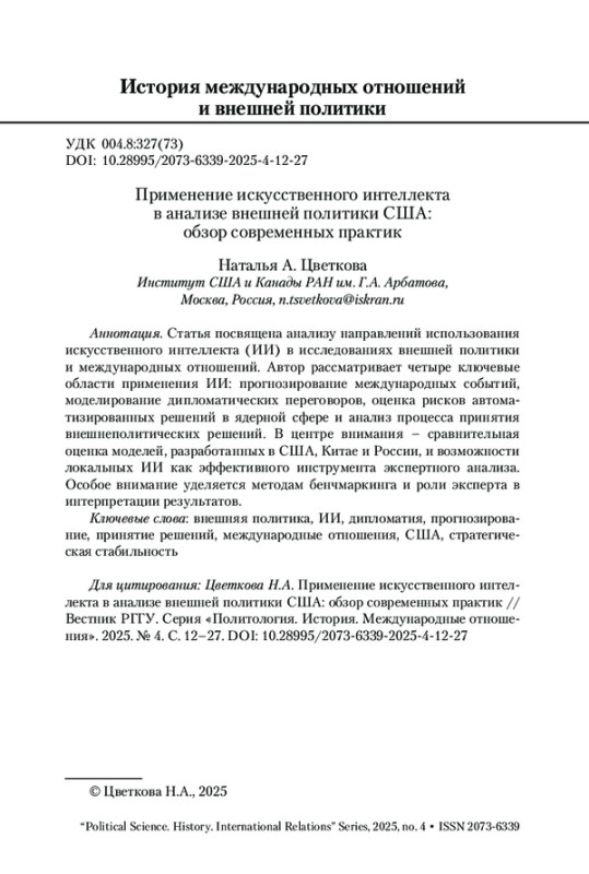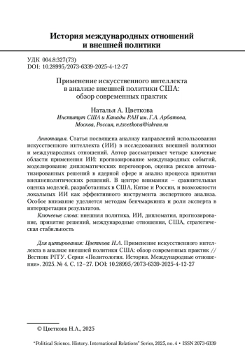 Статья посвящена анализу направлений использования искусственного интеллекта (ИИ) в исследованиях внешней политики и международных отношений. Автор рассматривает четыре ключевые области применения ИИ: прогнозирование международных событий, моделирование дипломатических переговоров, оценка рисков автоматизированных решений в ядерной сфере и анализ процесса принятия внешнеполитических решений. В центре внимания – сравнительная оценка моделей, разработанных в США, Китае и России, и возможности локальных ИИ как эффективного инструмента экспертного анализа. Особое внимание уделяется методам бенчмаркинга и роли эксперта в интерпретации результатов.