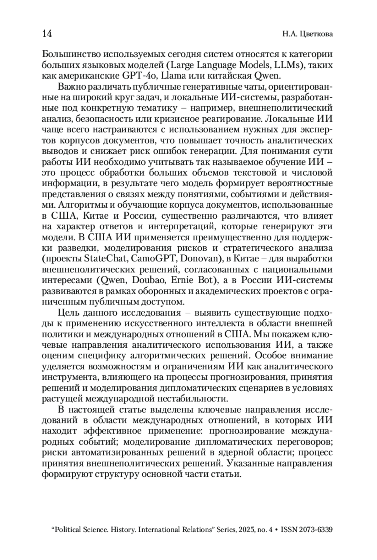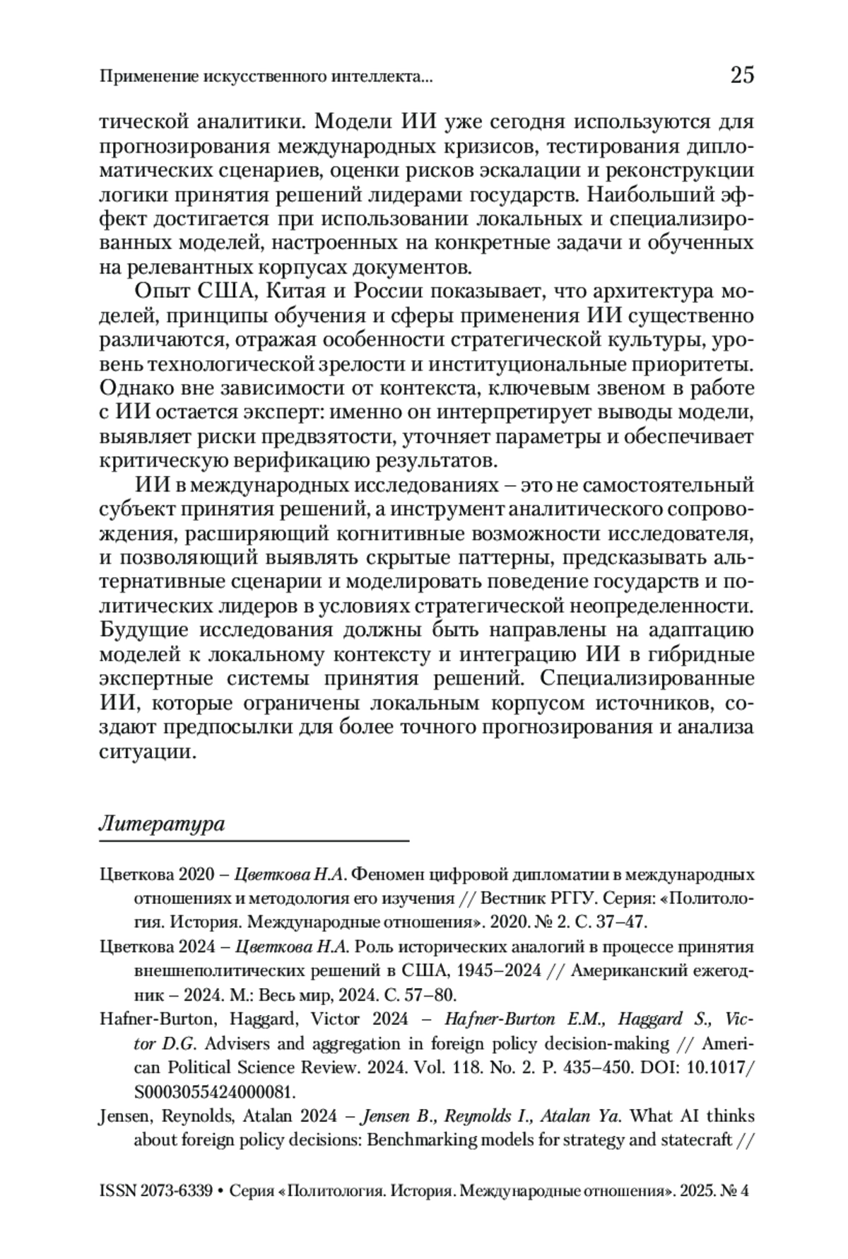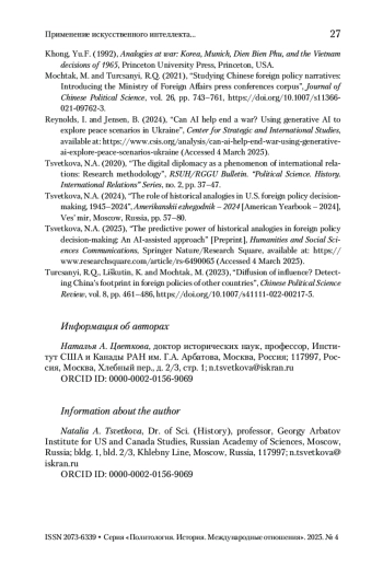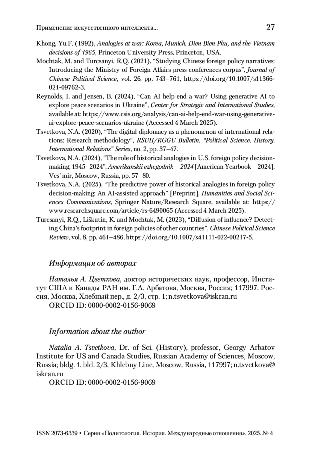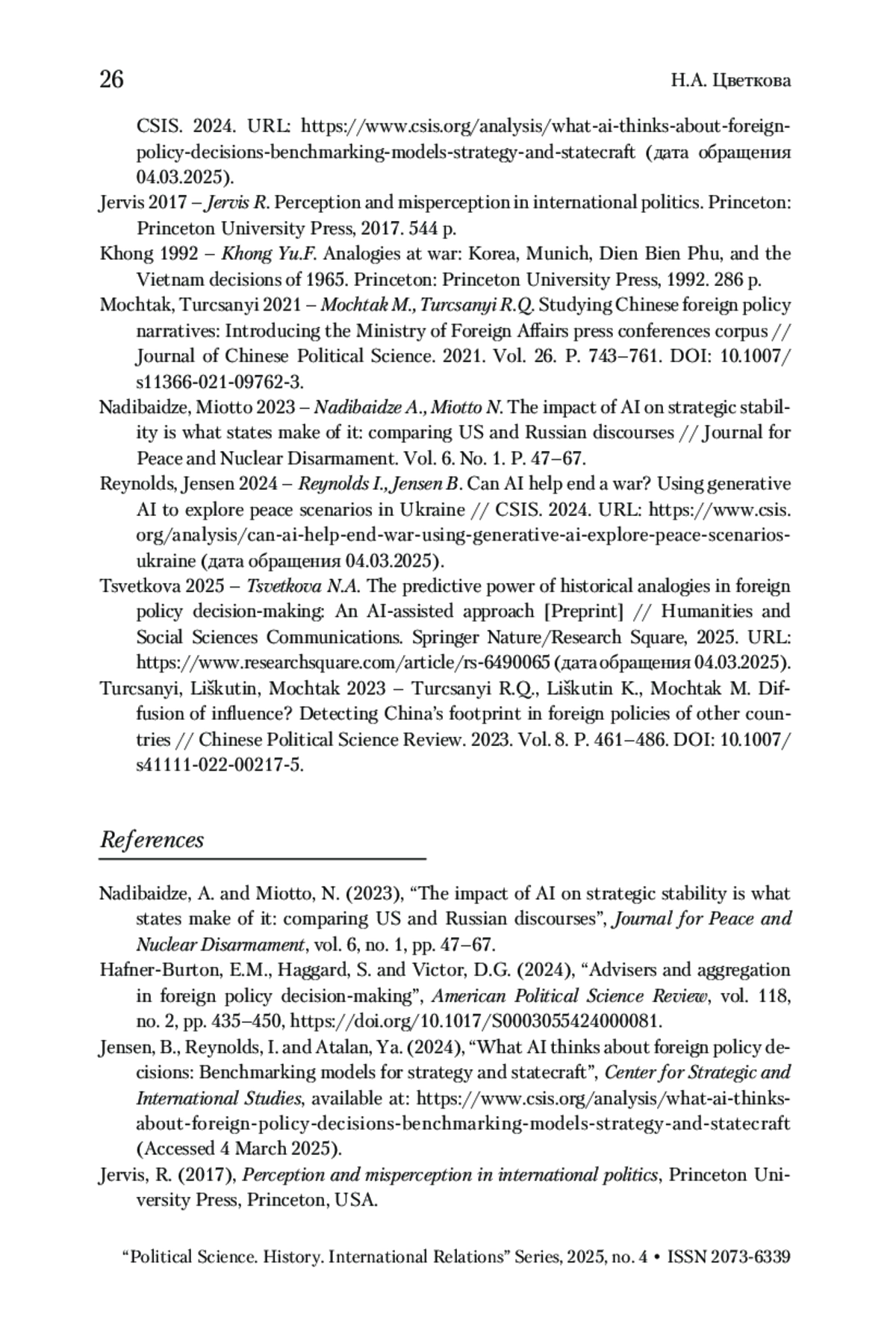 10. Tsvetkova 2025 - Tsvetkova N.A. The predictive power of historical analogies in foreign policy decision-making: An AI-assisted approach [Preprint] // Humanities and Social Sciences Communications. Springer Nature/Research Square, 2025. URL: https://www.researchsquare.com/article/rs-6490065 (дата обращения 04.03.2025).