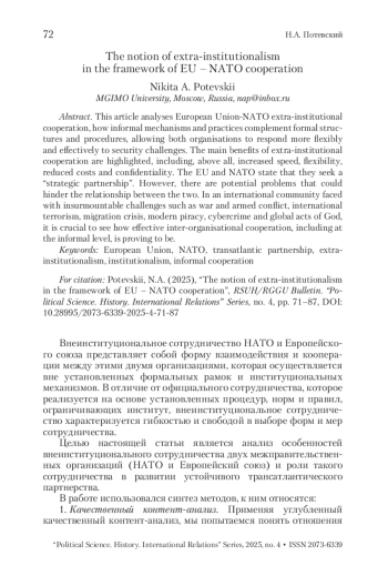 В статье проведен анализ внеинституционального сотрудничества Европейского союза и НАТО, то, каким образом неформальные механизмы и практики дополняют официальные структуры и процедуры, позволяя обеим организациям более гибко и эффективно реагировать на вызовы безопасности. Раскрываются основные преимущества внеинституционального сотрудничества, включающие, прежде всего, увеличение скорости, гибкости, снижение издержек и обеспечение конфиденциальности. ЕС и НАТО заявляют, что они стремятся к «стратегическому партнерству». Однако существуют потенциальные проблемы, которые могут помешать отношениям между ними. В международном сообществе, столкнувшемся с такими непреодолимыми проблемами, как войны и вооруженные конфликты, международный терроризм, миграционный кризис, современное пиратство, киберпреступность и глобальные обстоятельства непреодолимой силы, важно проследить, насколько эффективным оказывается межорганизационное сотрудничество, в том числе на неформальном уровне.