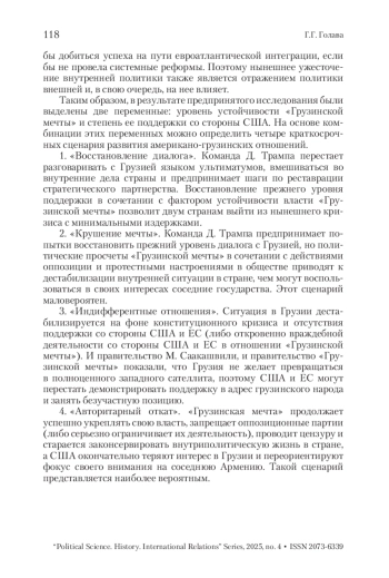 В статье анализируется изменение позиции Грузии в отношениях с США на фоне кризиса стратегического партнерства. Она нацелена на осмысление логики действий грузинского руководства в условиях современной международно-политической турбулентности с опорой на многофакторный анализ и метод прогнозирования. Автор рассматривает американо-грузинские отношения как целостную систему со своими структурно-функциональными связями и выделяет в них две значимые и независимые переменные – устойчивость нынешней власти в Грузии и степень ее поддержки американской администрацией. На основе комбинации этих переменных предлагается четыре сценария развития американо-грузинских отношений – «восстановление диалога», «крушение мечты», «индифферентные отношения», «авторитарный откат» – и представляются краткосрочные прогнозы.