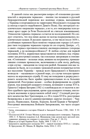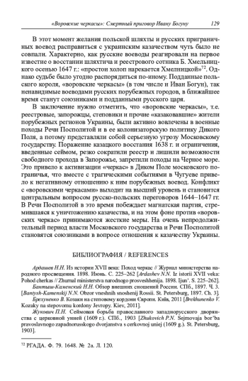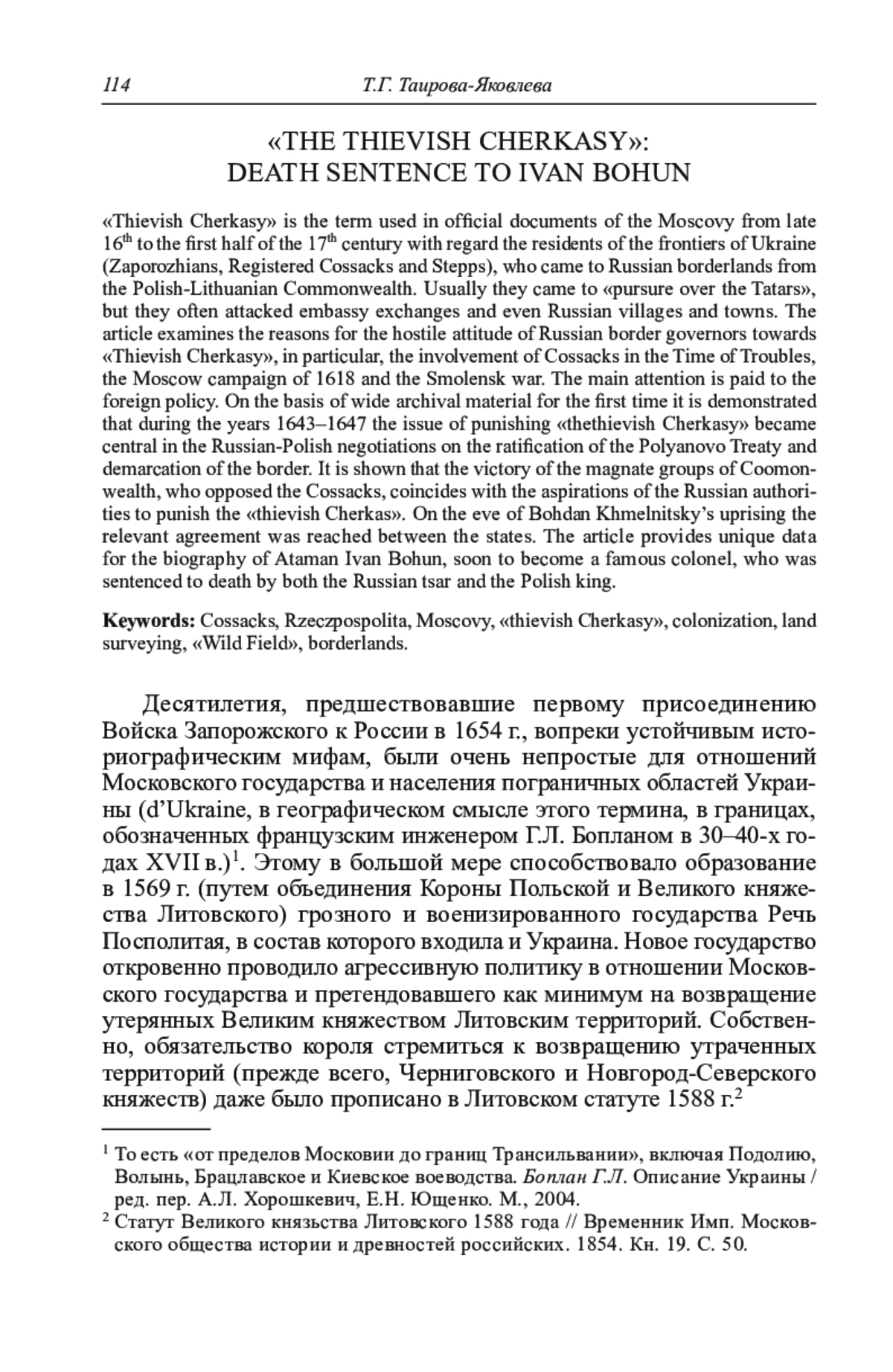 «Воровскими черкасами» назывались в официальных документах Московского государства конца XVI – первой половины XVII в. жители пограничных территорий Украины (запорожцы, реестровые и степовики), вторгавшиеся на русское пограничье из Речи Посполитой. Обычно они приходили для «поиска над татарами», но нередко нападали на посольские размены и даже станицы и города. В статье рассматривается причина враждебного отношения русских порубежных воевод к «воровским черкасам». В частности, их участие в Смуте, Московском походе 1618 г. и Смоленской войне. Основное внимание в статье уделяется внешнеполитическому контексту. На основе широкого архивного материала впервые показано, что на протяжении 1643–1647 гг. вопрос о наказании «воровских черкас» становится центральным в русско-польских переговорах о ратифицировании Поляновского договора и межевании границы. Показано, что победа магнатских группировок Речи Посполитой, выступавших против казачества, совпадает со стремлениями русских властей наказать «воровских черкас». Накануне восстания Б. Хмельницкого такое соглашение между государствами было достигнуто. В статье приводятся уникальные данные к биографии атамана Ивана Богуна, будущего знаменитого полковника, в частности, что ему был вынесен смертный приговор как русским царем, так и польским королем.