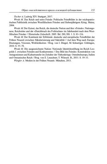 49. Wrede M. Das Reich und seine Feinde: Politische Feindbilder in der reichspatriotischen Publizistik zwischen Westfälischem Frieden und Siebenjährigem Krieg. Mainz, 2004.