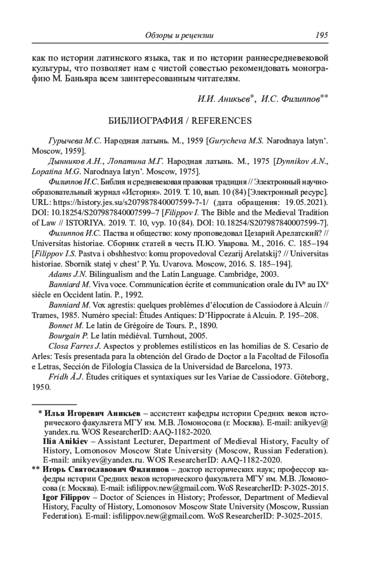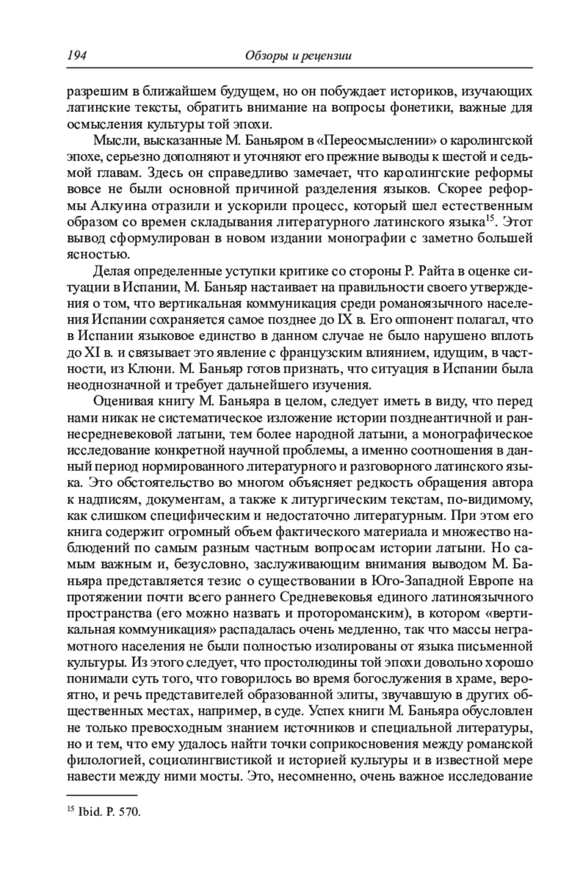 Рецензируемая монография представляет собой переиздание этой книги, вышедшее в свет на французском языке в 1992 г., дополненное автором с учетом новейших исследований. Она содержит богатый материал по истории латинского языка Поздней Античности и Раннего Средневековья и формирования на его основе западно-романских языков, но не является систематическим изложением фактов, характеризующих этот процесс. Перед нами исследование одного из важнейших его аспектов: соотношения в эту эпоху литературного латинского языка, с одной стороны, и разговорного – с другой. Анализируя самые разные источники (трактаты, проповеди, жития святых, хроники, акты церковных соборов, в меньшей мере документы и надписи), автор приходит к выводу, что до конца VIII в., в Италии – до конца IX в. и даже позднее, сохранялось определенное единство между языком образованной элиты и языком плохо или вовсе не образованного населения, что обеспечивало вертикальную коммуникацию между этими социальными группами. Сохранялась и возможность коммуникации на одном языке во всем ареале романской части Европы. Эти выводы очень важны для осмысления социокультурных процессов данной эпохи и информативности дошедших до нас источников. Критически воспринимая некоторые выводы, содержащиеся в данной книге, авторы рецензии оценивают ее очень высоко.