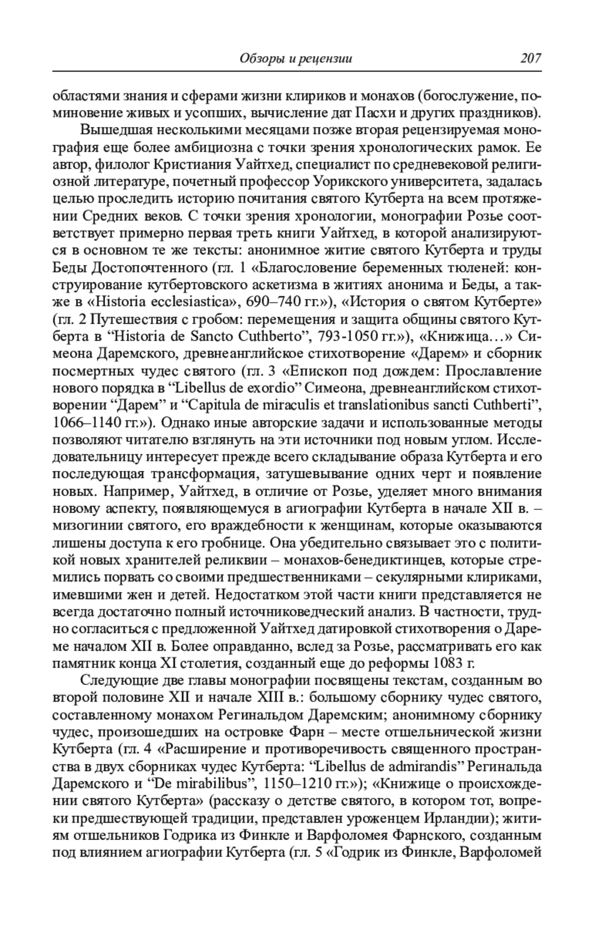 В обзоре рассмотрены две новые книги британских исследователей, посвященные почитанию святого Кутберта в Средние века и восприятию прошлого членами его общины, которая первоначально располагалась на острове Линдисфарн, позднее переместилась в Честер-ле-Стрит, а затем в Дарем. Автор первой рецензируемой монографии, историк Ч. Розье, рассматривает широкий круг текстов, связанных с восприятием и конструированием прошлого членами этой общины (с конца VII по первую треть XII в.). Несмотря на отдельные неточности, работа представляется удачным примером комплексного анализа локальной средневековой историографической традиции на большом временном промежутке и с использованием широкой источниковой базы. Вторая рецензируемая книга написана филологом К. Уайтхед и посвящена всей средневековой истории культа святого Кутберта (конец VII – XV в.). Исследовательница, с одной стороны, выявляет основные черты, характерные для «кутбертовской» аскетической традиции, с другой – показывает многогранный образ святого, менявшийся в зависимости от исторического и географического контекста