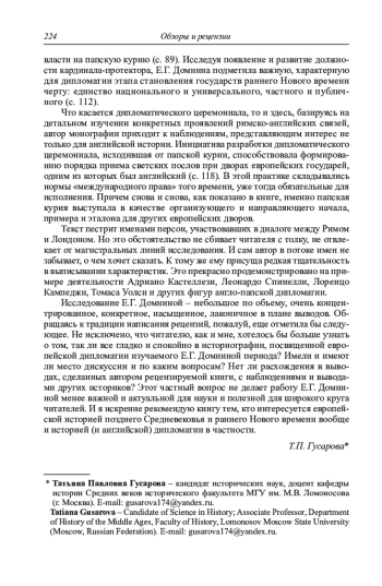 ГУСАРОВА Т. П. ДОМНИНА Е. Г. ДИПЛОМАТИЯ В ЭПОХУ ПЕРЕМЕН: ТЮДОРЫ И РИМСКАЯ КУРИЯ (1485-1558 ГГ.). М.; СПБ.: ПЕТРОГЛИФ, ЦЕНТР ГУМАНИТАРНЫХ ИНИЦИАТИВ, 2020. 240 С. (MEDIEVALIA) // СРЕДНИЕ ВЕКА. 2021. Т. 82 № 3