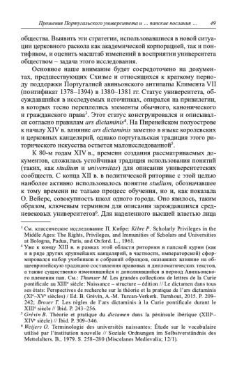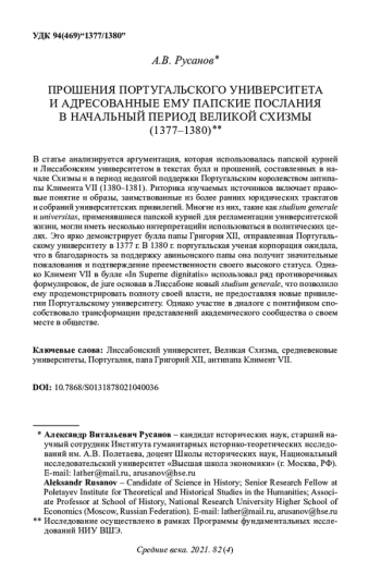 В статье анализируется аргументация, которая использовалась папской курией и Лиссабонским университетом в текстах булл и прошений, составленных в начале Схизмы и в период недолгой поддержки Португальским королевством антипапы Климента VII (1380–1381). Риторика изучаемых источников включает правовые понятие и образы, заимствованные из более ранних юридических трактатов и собраний университетских привилегий. Многие из них, такие как studium generale и universitas, применявшиеся папской курией для регламентации университетской жизни, могли иметь несколько интерпретацийи использоваться в политических целях. Это ярко демонстрирует булла папы Григория XII, отправленная Португальскому университету в 1377 г. В 1380 г. португальская ученая корпорация ожидала, что в благодарность за поддержку авиньонского папы она получит значительные пожалования и подтверждение преемственности своего высокого статуса. Однако Климент VII в булле «In Superne dignitatis» использовал ряд противоречивых формулировок, de jure основав в Лиссабоне новый studium generale, что позволило ему продемонстрировать полноту своей власти, не предоставляя новые привилегии Португальскому университету. Однако участие в диалоге с понтификом способствовало трансформации представлений академического сообщества о своем месте в обществе