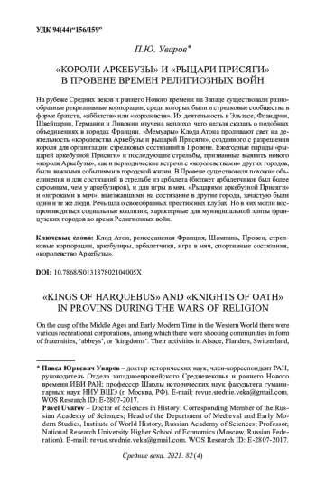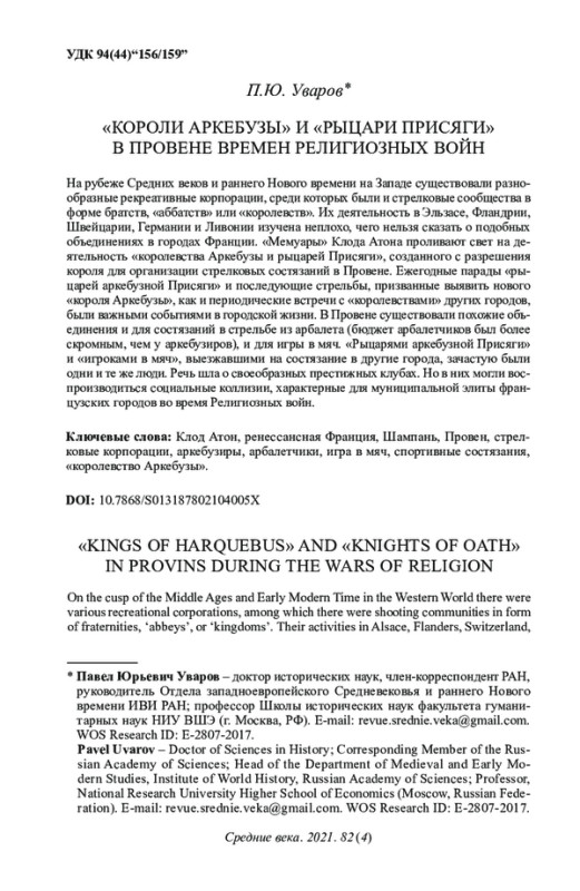 УВАРОВ П. Ю. "КОРОЛИ АРКЕБУЗЫ" И "РЫЦАРИ ПРИСЯГИ" В ПРОВЕНЕ ВРЕМЕН РЕЛИГИОЗНЫХ ВОЙН // СРЕДНИЕ ВЕКА. 2021. Т. 82 № 4