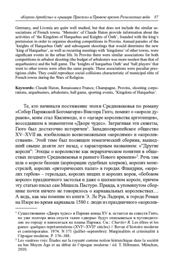 Ключевые фразы: клод атон, ренессансная франция, шампань, провен, стрелковые корпорации, аркебузиры, арбалетчики, игра в мяч, спортивные состязания, "королевство аркебузы"