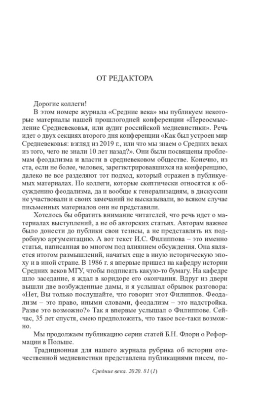 В этом номере журнала «Средние века» мы публикуем некоторые материалы нашей прошлогодней конференции «Переосмысление Средневековья, или аудит российской медиевистики». Речь идет о двух секциях второго дня конференции «Как был устроен мир Средневековья: взгляд из 2019 г., или что мы знаем о Средних веках из того, чего не знали 10 лет назад?». Они были посвящены проблемам феодализма и власти в средневековом обществе. Конечно, из ста, если не более, человек, зарегистрировавшихся на конференцию, далеко не все разделяют тот подход, который отражен в публикуемых материалах. Но коллеги, которые скептически относятся к обсуждению феодализма, да и вообще к генерализациям, в дискуссии не участвовали и своих замечаний не высказывали, во всяком случае письменных материалов они не представили