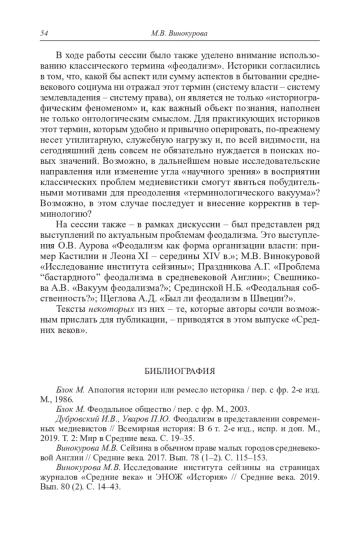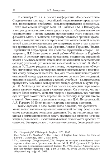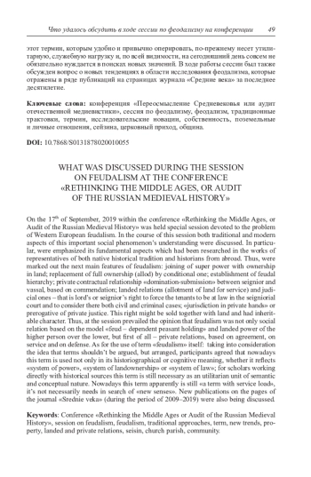 ВИНОКУРОВА М. В. ЧТО УДАЛОСЬ ОБСУДИТЬ В ХОДЕ СЕССИИ ПО ФЕОДАЛИЗМУ НА КОНФЕРЕНЦИИ "ПЕРЕОСМЫСЛЕНИЕ СРЕДНЕВЕКОВЬЯ, ИЛИ АУДИТ РОССИЙСКОЙ МЕДИЕВИСТИКИ" // СРЕДНИЕ ВЕКА. 2020. Т. 81 № 1