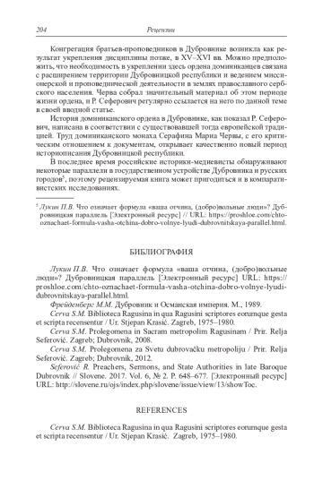Рецензируемая книга о Конгрегации Ордена братьев-проповедников Дубровника (Рагуза) издана в 2017 г. к 800-летию образования доминиканского ордена в Европе. Том включает исследовательскую статью ведущего научного сотрудника Института исторических наук Хорватской академии наук и искусств в Дубровнике Релье Сеферовича и публикацию латинской рукописи «Памятники Конгрегации Святого Доминика Ордена братьев-проповедников в Рагузе», автором которой является Серафин Мариа Черва (1686–1759). Книга содержит важные свидетельства о религиозной жизни на Балканах в XIII–XIV вв. Российские медиевисты обнаруживают некоторые параллели в государственном устройстве Дубровника и русских городов, поэтому рецензируемая книга может пригодиться и в компаративистских исследованиях.