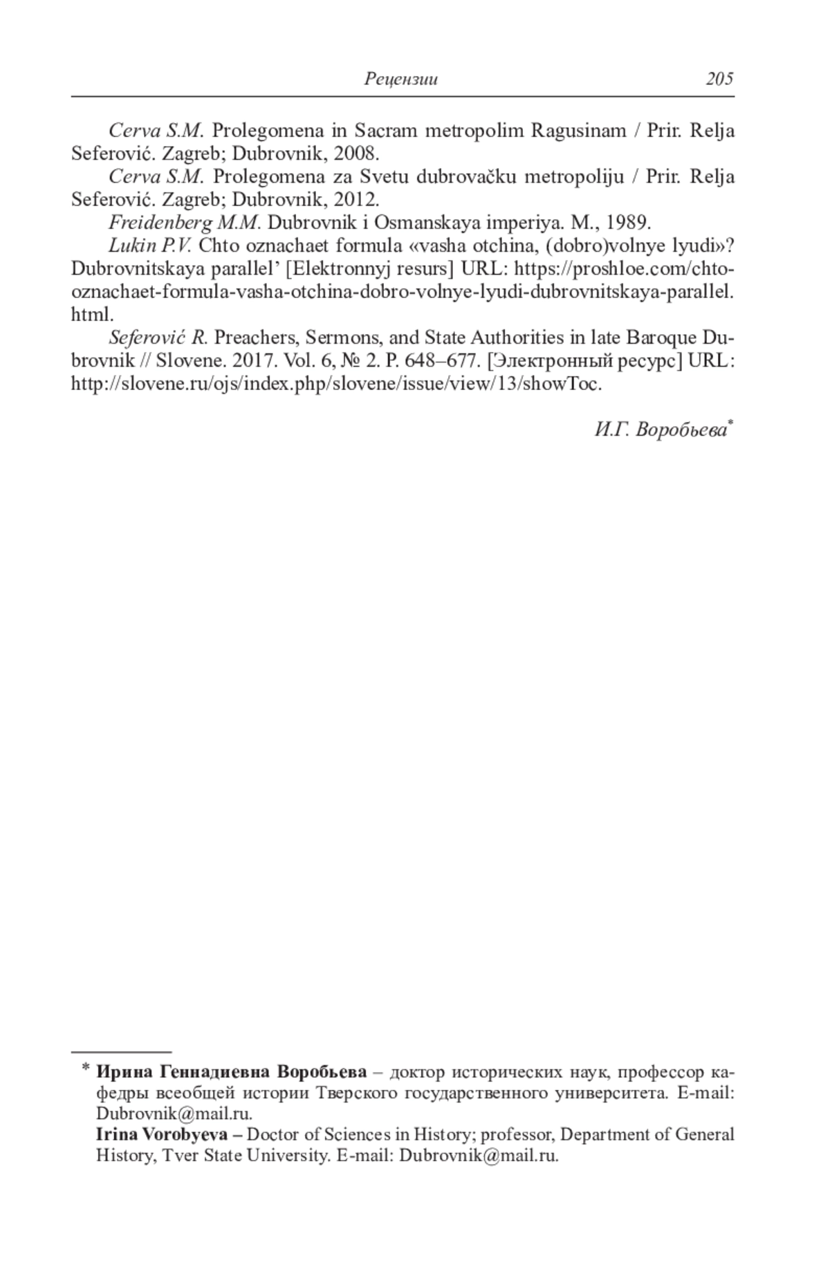 6. Seferovic R. Preachers, Sennons, and State Authorities in late Baroque Dubrovnik // Slovene. 2017. Vol. 6, № 2. P. 648-677. [Электронный ресурс] URL: http://slovene.ru/ojs/index.php/slovene/issue/view/13/showToc. EDN: UVFXQY