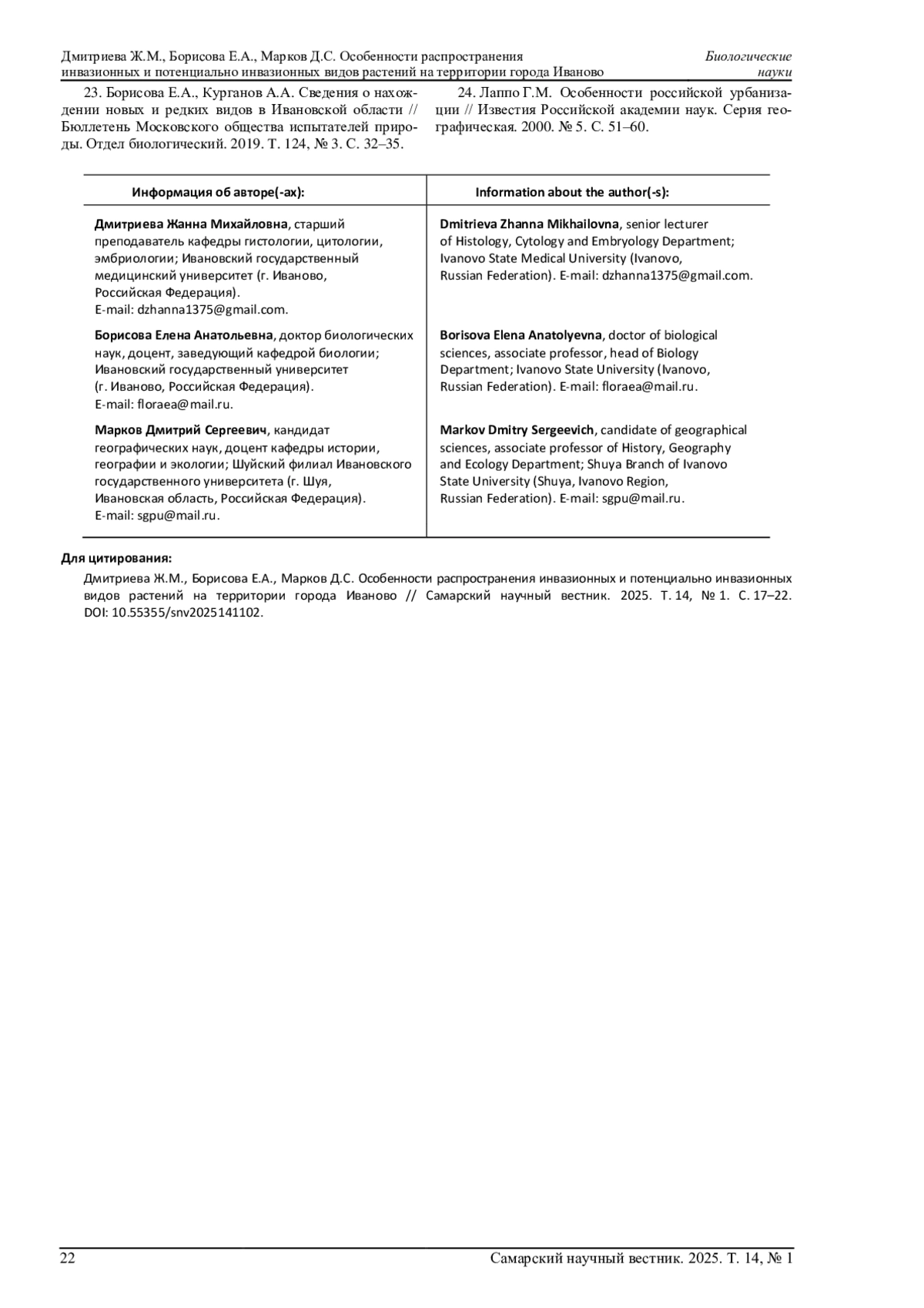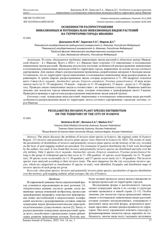 ДМИТРИЕВА Ж. М., БОРИСОВА Е. А., МАРКОВ Д. С. ОСОБЕННОСТИ РАСПРОСТРАНЕНИЯ ИНВАЗИОННЫХ И ПОТЕНЦИАЛЬНО ИНВАЗИОННЫХ ВИДОВ РАСТЕНИЙ НА ТЕРРИТОРИИ ГОРОДА ИВАНОВО // САМАРСКИЙ НАУЧНЫЙ ВЕСТНИК. 2025. ТОМ 14, № 1