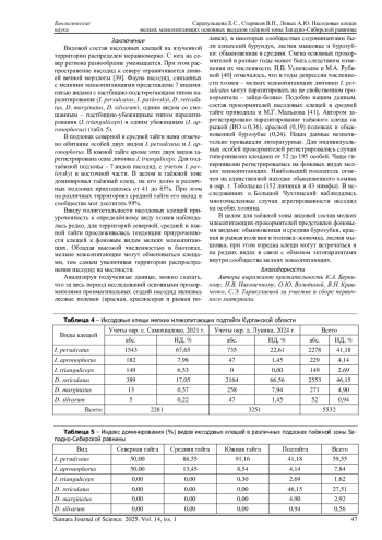 Статья: ИКСОДОВЫЕ КЛЕЩИ МЕЛКИХ МЛЕКОПИТАЮЩИХ ОСНОВНЫХ ВЫДЕЛОВ ТАЁЖНОЙ ЗОНЫ ЗАПАДНО-СИБИРСКОЙ РАВНИНЫ (2025)