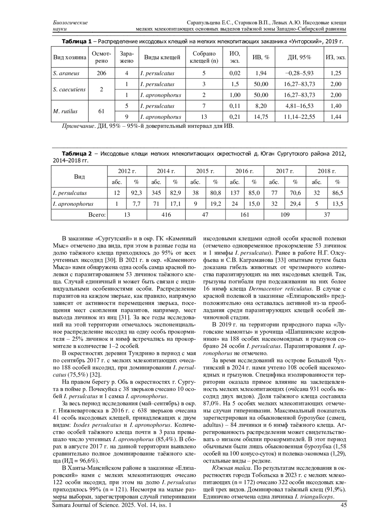 САРАПУЛЬЦЕВА Е. С., СТАРИКОВ В. П., ЛЕВЫХ А. Ю. ИКСОДОВЫЕ КЛЕЩИ МЕЛКИХ МЛЕКОПИТАЮЩИХ ОСНОВНЫХ ВЫДЕЛОВ ТАЁЖНОЙ ЗОНЫ ЗАПАДНО-СИБИРСКОЙ РАВНИНЫ // САМАРСКИЙ НАУЧНЫЙ ВЕСТНИК. 2025. ТОМ 14, № 1