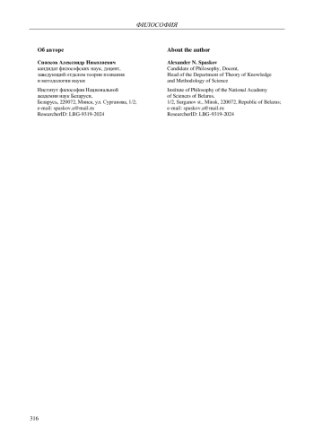 14. Спасков А.Н. Принципы субстанциально-информационной онтологии // Философские исследования: сб. науч. тр. / под ред. Т.И. Адуло и др.; Ин-т философии НАН Беларуси. Минск: Беларуская навука, 2021. Вып. 8. С. 67-75.