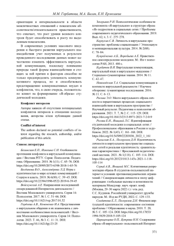 4. Гордеева А.В., Кононенко И.А. Представления о виртуальном общении и их взаимосвязь с личностными особенностями пользователей // Вестник Московского университета. Серия 14: Психология. 2023. Т. 46, № 3. С. 11-31. DOI: 10.11621/lpj-23-25 EDN: PFYYHP