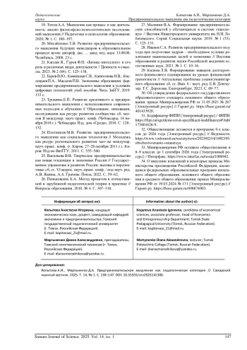 2. Куркина Н.Р., Мальтисова Т.В. Развитие предпринимательских навыков как фактор экономического мышления у студентов педагогического вуза // Макаренковские чтения: сб. мат-лов I всерос. науч.-практ. конф. Воронеж, 2023. С. 108-111.