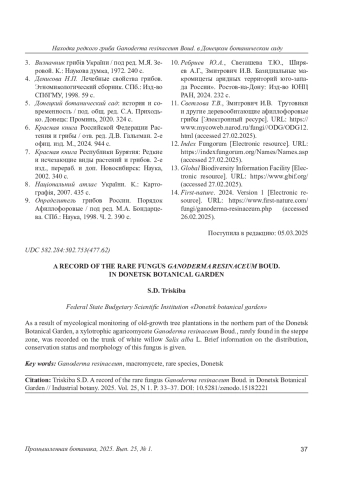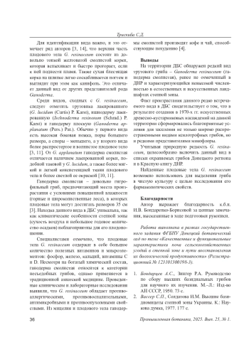 Грибы являются обязательным гетеротрофным компонентом и присутствуют во всех наземных сообществах, выполняя в них самые разнообразные функции, среди которых одной из важнейших является разрушение живой и мертвой древесины. В этой связи особенный интерес представляют находки трутовых дереворазрушающих грибов рода Ganoderma P. Karst, так как они довольно редко встречаются в аридных зонах, часто имеют фитопатологическое значение, вызывая стволовые гнили, а некоторые редко встречаемые виды получили природоохранный статус на территории Российской Федерации [6, 7].