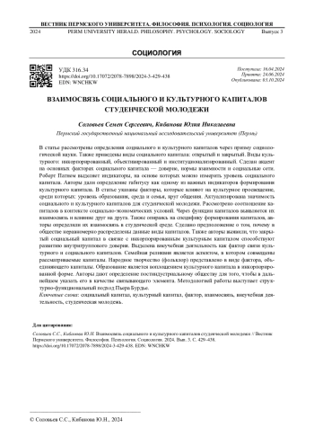 В статье рассмотрены определения социального и культурного капиталов через призму социологической науки. Также приведены виды социального капитала: открытый и закрытый. Виды культурного: инкорпорированный, объективированный и институционализированный. Сделан акцент на основных факторах социального капитала - доверие, нормы взаимности и социальные сети. Роберт Патнем выделяет индикаторы, на основе которых можно измерить уровень социального капитала. Авторы дали определение габитусу как одному из важных индикаторов формирования культурного капитала. В статье указаны факторы, которые влияют на культурное просвещение, среди которых: уровень образования, среда и семья, круг общения. Актуализирована значимость социального и культурного капиталов для студенческой молодежи. Рассмотрено соотношение капиталов в контексте социально-экономических условий. Через функции капиталов выявляется их взаимосвязь и влияние друг на друга. Также опираясь на специфику формирования капиталов, авторы определили их взаимосвязь в студенческой среде. Сделано предположение о том, почему в обществе неравномерно распределены данные виды капиталов. Также авторы выявили, что закрытый социальный капитал в связке с инкорпорированным культурным капиталом способствуют развитию внутригруппового доверия. Выделена внеучебная деятельность как фактор связи культурного и социального капиталов. Семейная реликвия является аспектом, в котором совмещены рассматриваемые капиталы. Народное творчество (фольклор) представлено в виде фактора, объединяющего капиталы. Образование является воплощением культурного капитала в инкорпорированной форме. Авторы дают определение постиндустриальному обществу для того, чтобы в дальнейшем указать его в качестве связывающего элемента. Методологией работы выступает структурно-функциональный подход Пьера Бурдье.