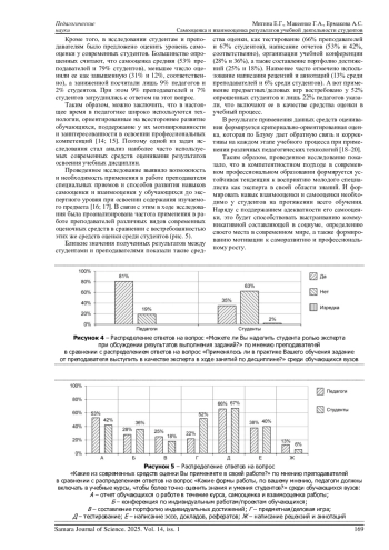 В статье рассмотрено отношение педагогов и обучающихся к роли взаимооценки и самооценки в учебной деятельности как фактора достижения экспертного уровня освоения содержания отдельных дисциплин. Результаты анкетирования, проведенного среди преподавателей и студентов вузов, показали востребованность участия студентов в оценивании одногруппников как со стороны педагогов, так и самих обучающихся. При этом преподаватели высказывали осторожность при использовании взаимооценки студентов в учебном процессе, а сами обучающиеся считали выставление оценок одногруппникам субъективным процессом, основанным на личных взаимоотношениях, а не по объективным критериям. Авторами проанализированы результаты изучения мнения о роли самооценки учебных достижений студентов разных направлений подготовки и ее влияние на становление профессиональной компетентности. Сделан вывод, что для развития навыка экспертного оценивания у обучающихся, педагогам необходимо использовать элементы оценивания в текущей учебной работе, ориентируясь на современную версию таксономии Блума по формированию учебных навыков. Для этого важно в учебном процессе наряду с традиционными средствами оценивания применять и инновационные, такие как составление портфолио, организация учебных конференций и другие современные средства оценивания, поскольку они не только расширяют возможности оценивания для преподавателя, но и востребованы среди студентов.