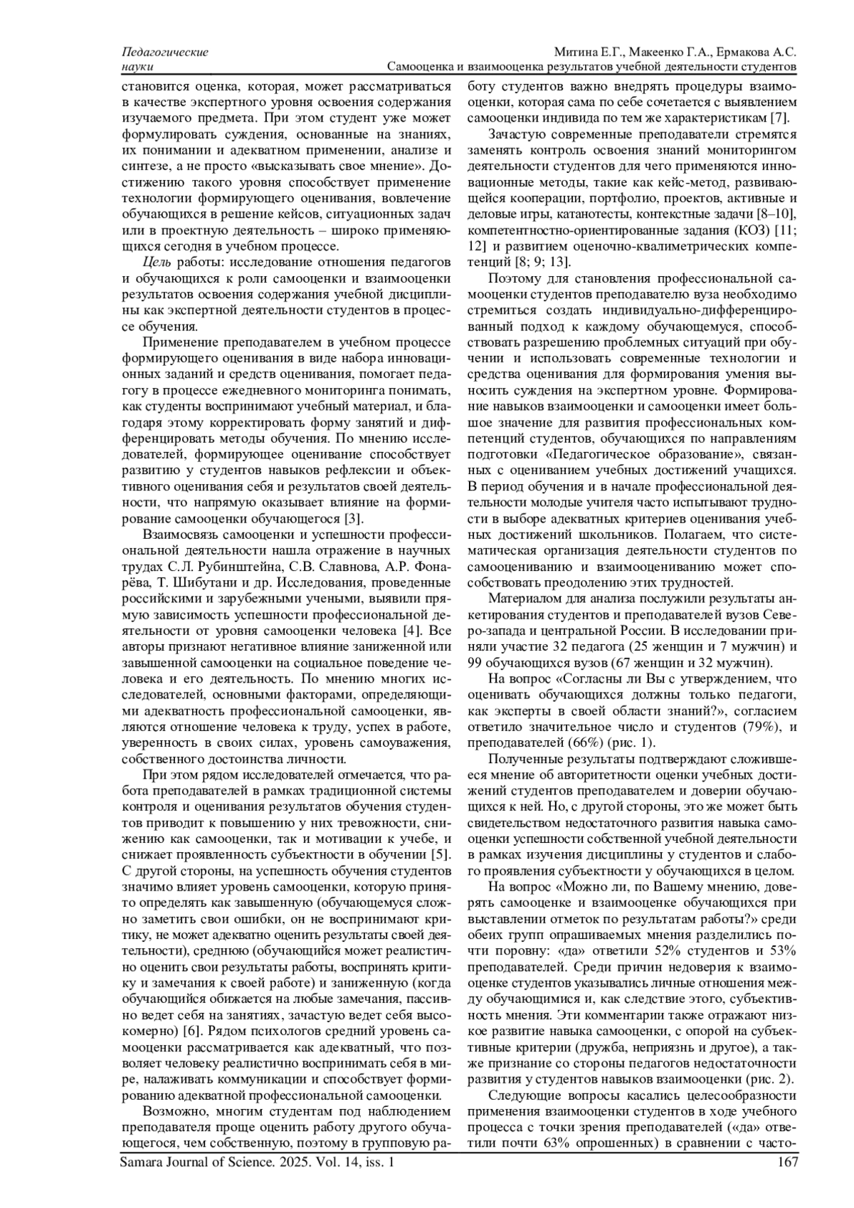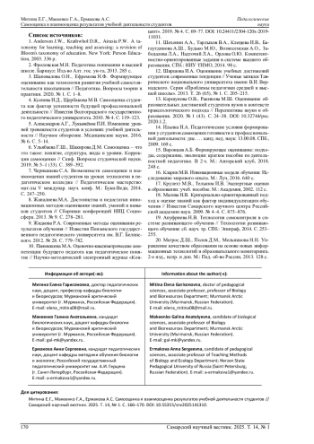 МИТИНА Е. Г., МАКЕЕНКО Г. А., ЕРМАКОВА А. С. САМООЦЕНКА И ВЗАИМООЦЕНКА РЕЗУЛЬТАТОВ УЧЕБНОЙ ДЕЯТЕЛЬНОСТИ СТУДЕНТОВ // САМАРСКИЙ НАУЧНЫЙ ВЕСТНИК. 2025. ТОМ 14, № 1