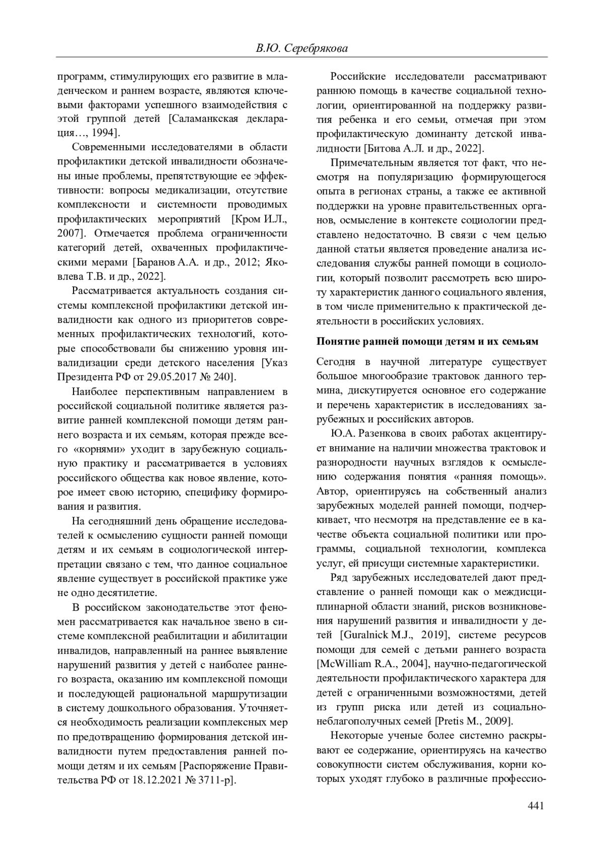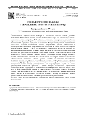 СЕРЕБРЯКОВА В. Ю. СОЦИОЛОГИЧЕСКИЕ ПОДХОДЫ К ОПРЕДЕЛЕНИЮ ПОНЯТИЯ РАННЕЙ ПОМОЩИ // ВЕСТНИК ПЕРМСКОГО УНИВЕРСИТЕТА. ФИЛОСОФИЯ. ПСИХОЛОГИЯ. СОЦИОЛОГИЯ. 2024. № 3