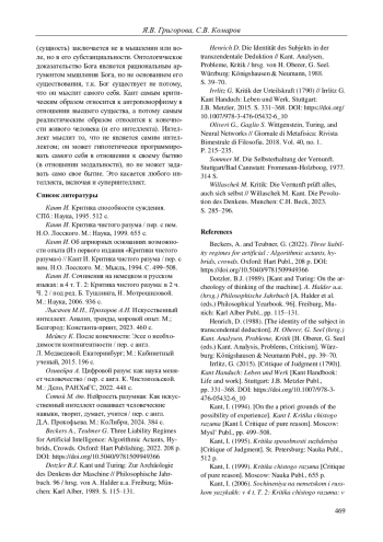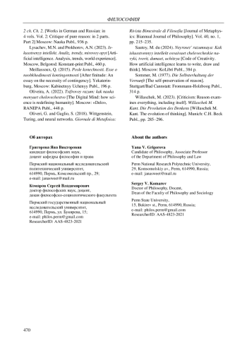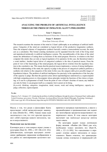 ГРИГОРОВА Я. В., КОМАРОВ С. В. АНАЛИЗ ПРОБЛЕМЫ ИСКУССТВЕННОГО ИНТЕЛЛЕКТА ЧЕРЕЗ ПРИЗМУ ФИЛОСОФИИ И. КАНТА // ВЕСТНИК ПЕРМСКОГО УНИВЕРСИТЕТА. ФИЛОСОФИЯ. ПСИХОЛОГИЯ. СОЦИОЛОГИЯ. 2024. № 4