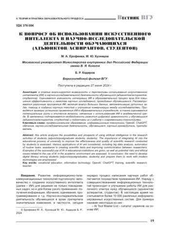 В статье анализируются возможности и перспективы использования искусственного интеллекта (ИИ) в научно-исследовательской деятельности обучающихся (адъюнктов/аспирантов, студентов). Оценивается значимость интеграции ИИ в образовательный процесс вуза для повышения эффективности и качества научных исследований, проводимых обучающимися. Рассматриваются различные приложения ИИ, включая анализ больших данных, автоматизацию рутинных задач, помощь в создании научных текстов и улучшение коммуникации между исследователями. Приводятся примеры успешного применения ИИ в образовательных учреждениях, а также оцениваются потенциальные риски и этические вопросы, связанные с использованием ИИ в академической среде. В заключении подчеркивается необходимость развития цифровой грамотности у обучающихся (адъюнктов/аспирантов, студентов) и подготовки их к работе с современными технологиями.