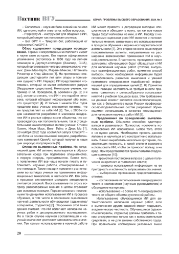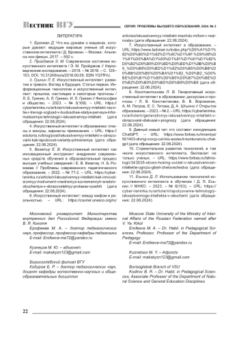 7. Константинова Л. В. Генеративный искусственный интеллект в образовании: дискуссии и прогнозы / Л. В. Константинова, В. В. Ворожихин, А. М. Петров, Е. С. Титова, Д. А. Штыхно // Открытое образование. - 2023. - № 2. - URL: https://cyberleninka.ru/article/n/generativnyy-iskusstvennyy-intellekt-v-obrazovanii-diskussii-i-prognozy (дата обращения: 22.06.2024). EDN: VPMIZK