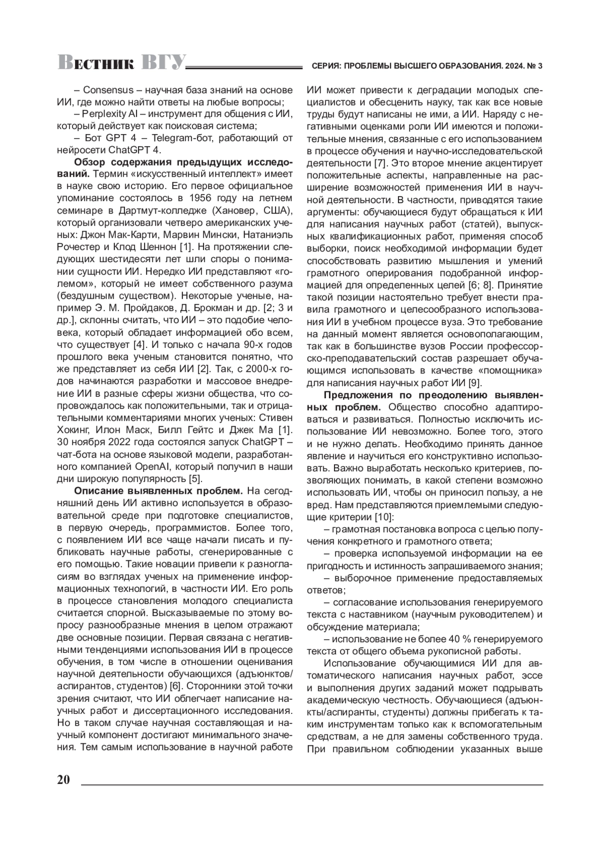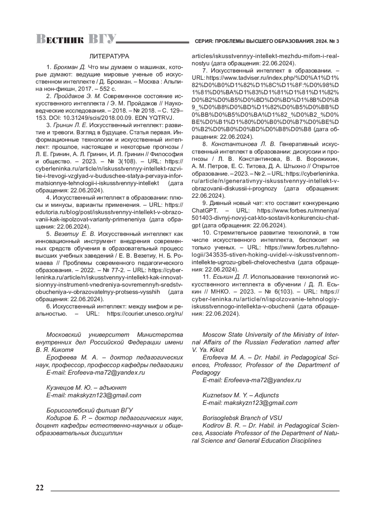 10. Еськин Д. Л. Использование технологий искусственного интеллекта в обучении / Д. Л. Еськин // МНКО. - 2023. - № 6(103). - URL: https://cyberleninka.ru/article/n/ispolzovanie-tehnologiy-iskusstvennogo-intellekta-v-obuchenii (дата обращения: 22.06.2024). EDN: JOPIAA