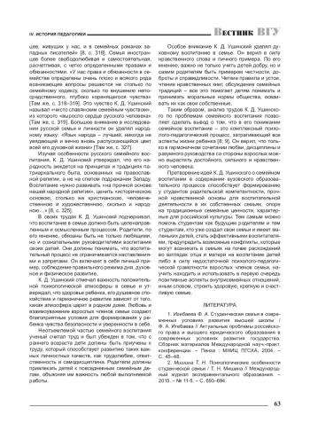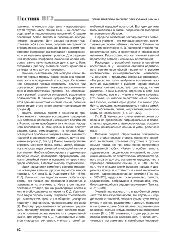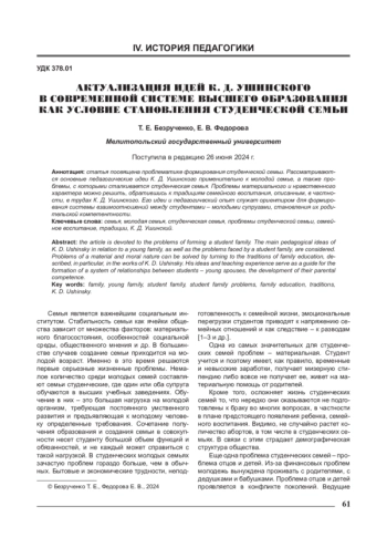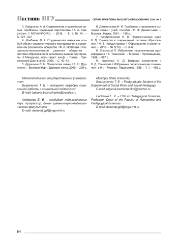 ФЁДОРОВА Е. В., БЕЗРУЧЕНКО Т. Е. АКТУАЛИЗАЦИЯ ИДЕЙ К. Д. УШИНСКОГО В СОВРЕМЕННОЙ СИСТЕМЕ ВЫСШЕГО ОБРАЗОВАНИЯ КАК УСЛОВИЕ СТАНОВЛЕНИЯ СТУДЕНЧЕСКОЙ СЕМЬИ // ВЕСТНИК ВОРОНЕЖСКОГО ГОСУДАРСТВЕННОГО УНИВЕРСИТЕТА. СЕРИЯ: ПРОБЛЕМЫ ВЫСШЕГО ОБРАЗОВАНИЯ. 2024. № 3