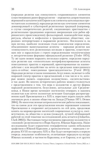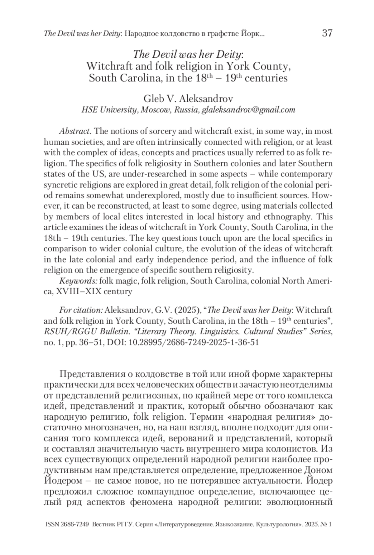 Представления о колдовстве в той или иной форме характерны практически для всех человеческих обществ и зачастую неотделимы от представлений религиозных, по крайней мере от того комплекса идей, представлений и практик, который обычно обозначают как народную религию, folk religion. Специфика народной религиозности на территории нынешних Южных штатов США в колониальный период остается относительно малоизученной, в первую очередь вследствие недостатка источников. Тем не менее до определенной степени она может быть реконструирована благодаря доступным сегодня материалам, собранным и обработанным интересующимися локальной историей представителями местных элит. Настоящая статья посвящена народному колдовству и «низовой» религиозности в графстве Йорк, Южная Каролина, в XVIII–XIX вв. В статье рассматриваются локальные особенности, отличающие народную культуру Южных колоний, в частности Каролины, и от Европы, и от других английских колоний, эволюция народной религиозности в колониальный период и в первые десятилетия после обретения США независимости, а также ее влияние на формирование специфической южной религиозности.