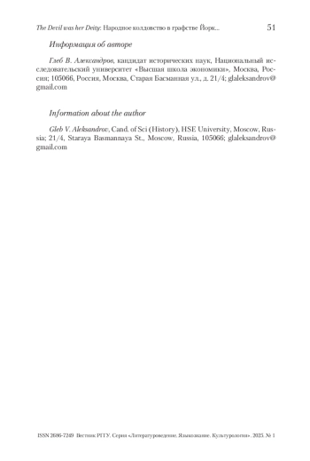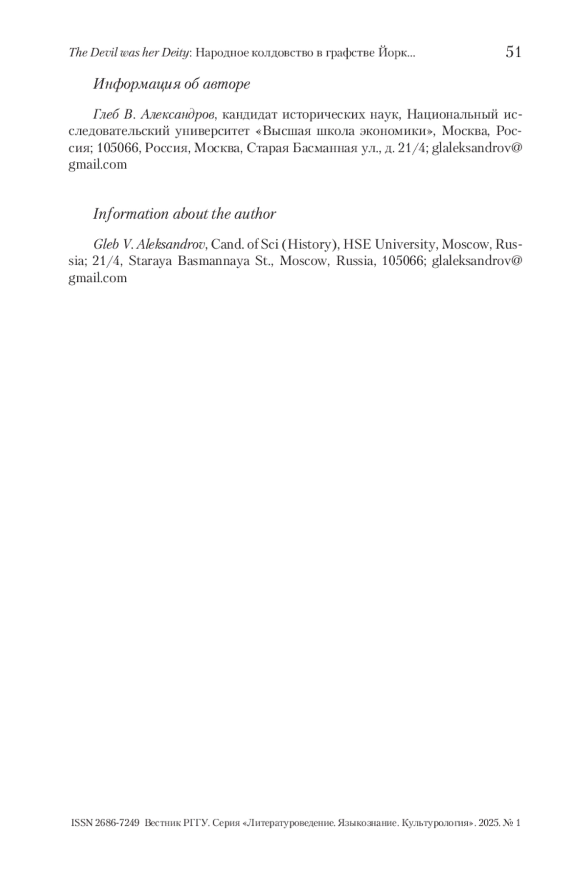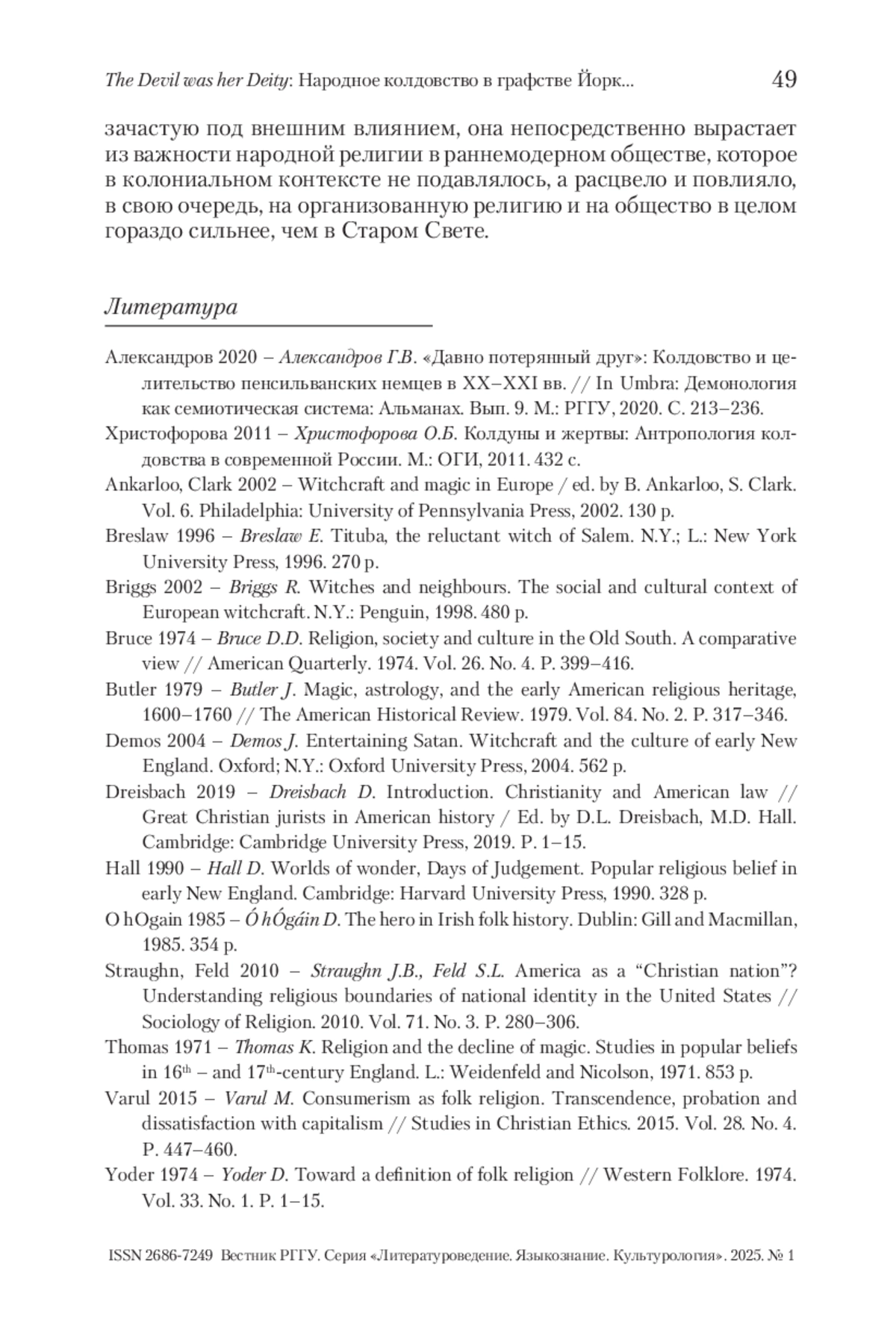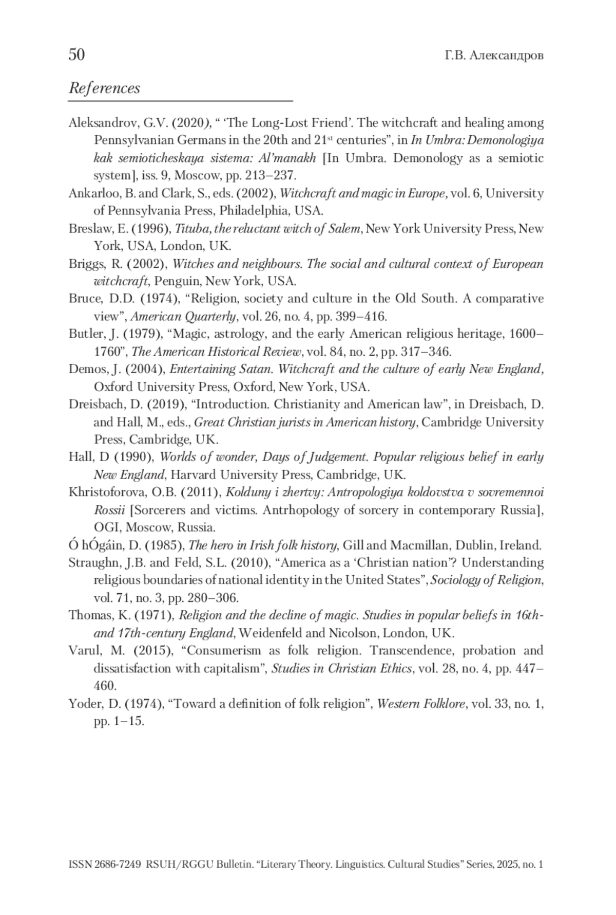 1. Александров 2020 - Александров Г.В. «Давно потерянный друг»: Колдовство и целительство пенсильванских немцев в XX-XXI вв. // In Umbra: Демонология как семиотическая система: Альманах. Вып. 9. М.: РГГУ, 2020. С. 213-236.